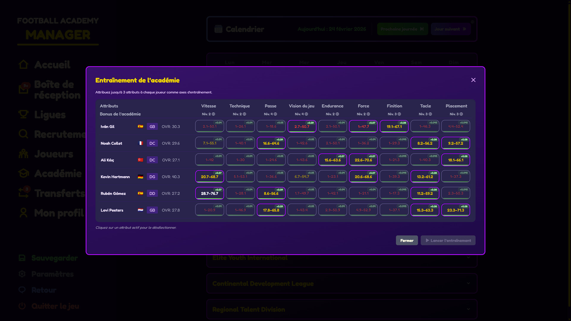 • Développer les talents — définis des entraînements ciblés (Endurance, Vision, Finition…) et laisse les minutes de jeu transformer le potentiel en progrès.