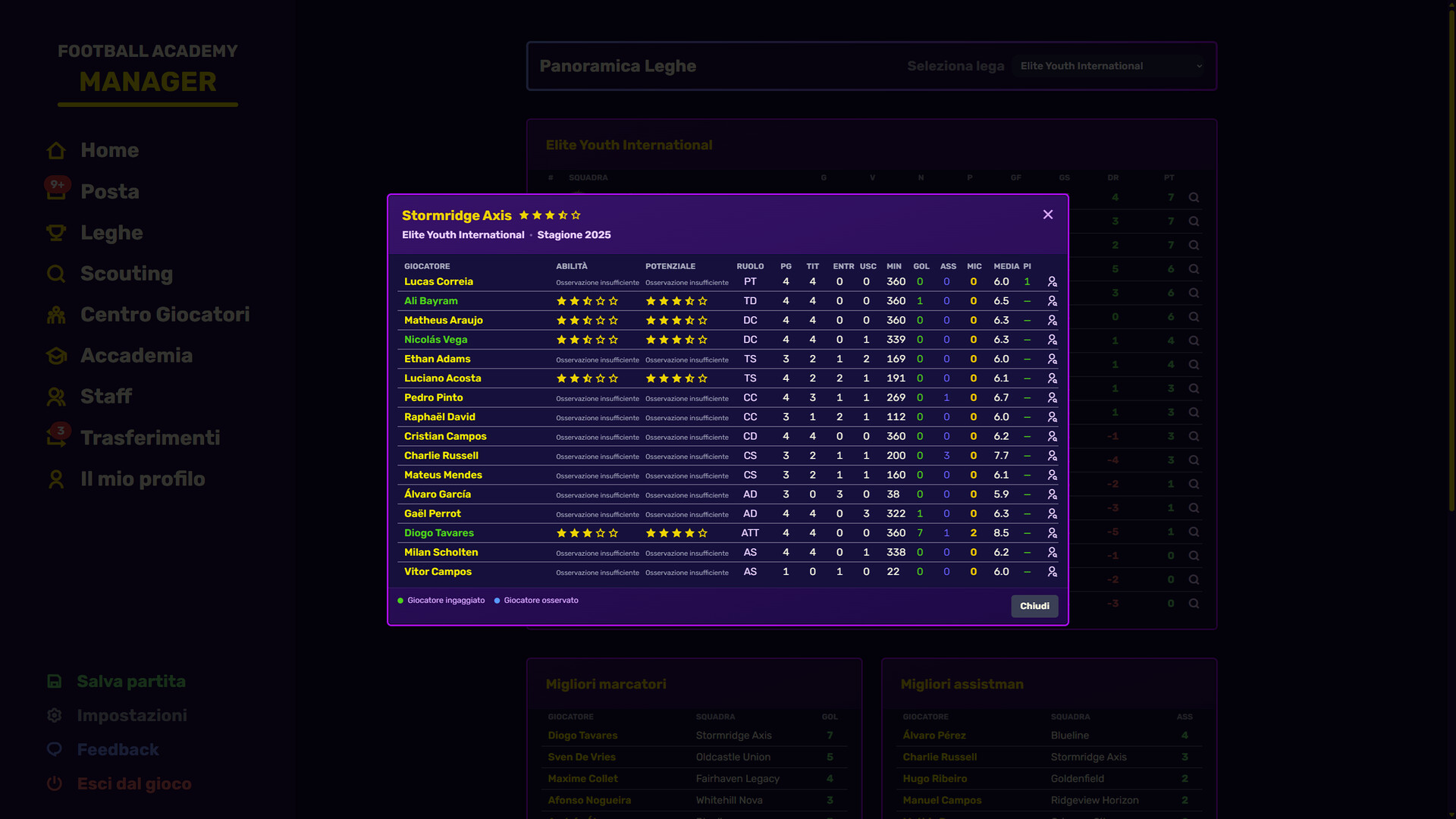 • Scouting dei giovani — guarda simulazioni di partita, rivela abilità e tratti nel tempo e metti sotto contratto i prospetti giusti per l’accademia.