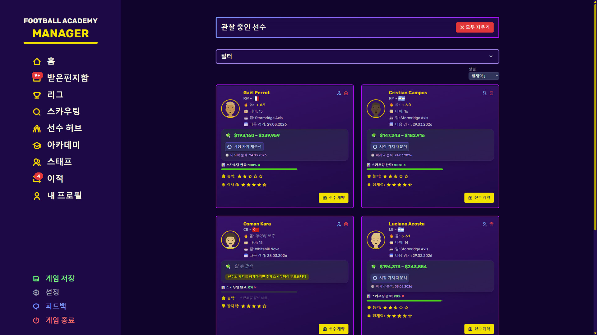 유망한 선수를 발굴하고, 그들의 강점을 찾아 아카데미로 영입하세요. 훈련을 통해 성장시키고, 적절한 시기에 이적 협상을 진행하며, 성공을 거듭해 축구계에서의 명성을 높이십시오.