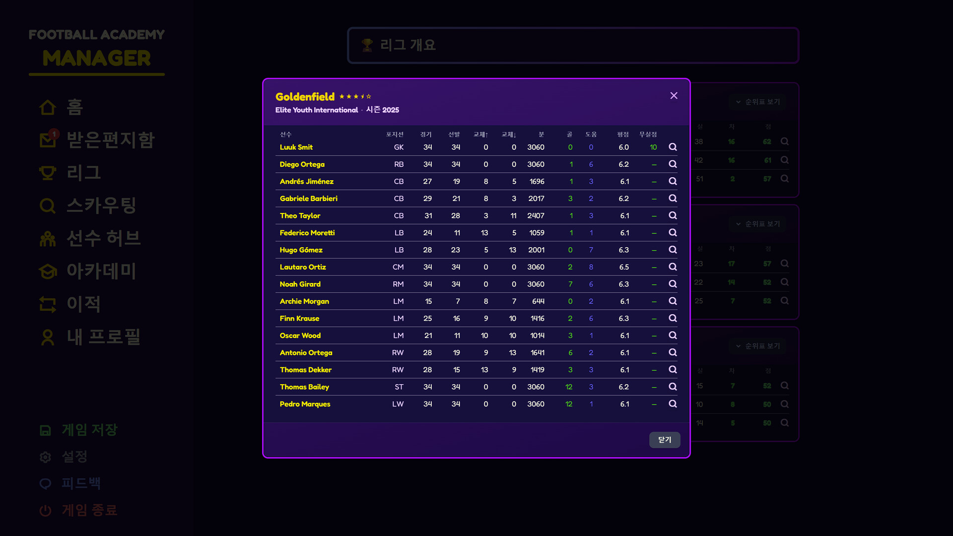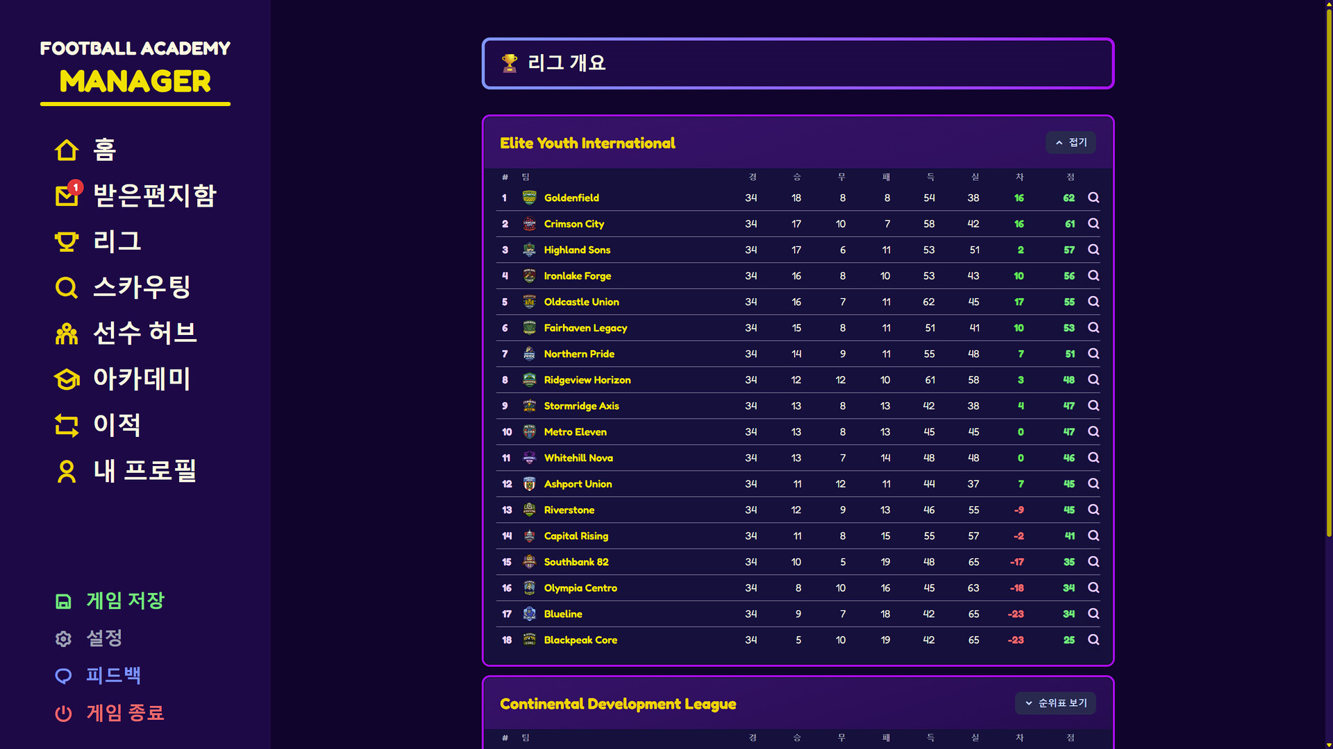 • 유망주 스카우트 — 경기 시뮬레이션을 보며 시간이 지날수록 능력과 특성이 드러나고, 알맞은 선수를 아카데미에 영입합니다.