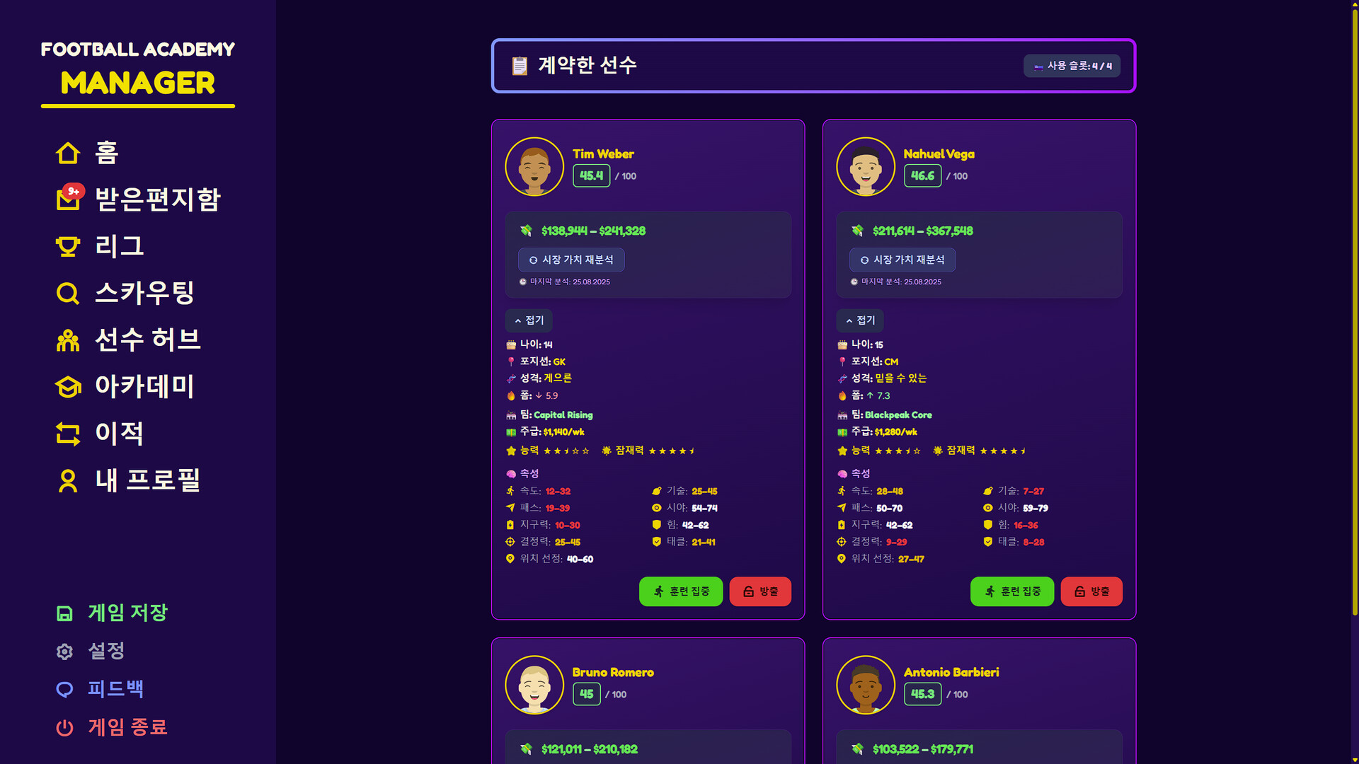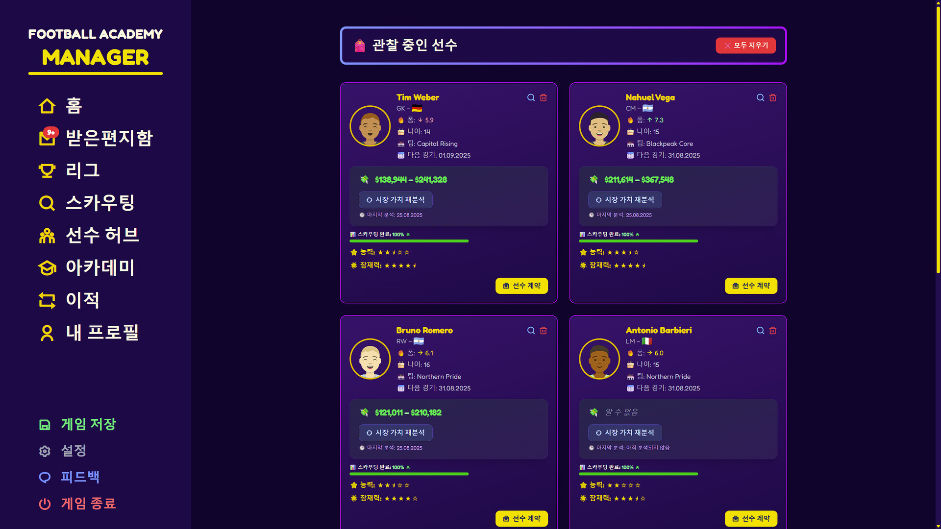 유망한 선수를 발굴하고, 그들의 강점을 찾아 아카데미로 영입하세요. 훈련을 통해 성장시키고, 적절한 시기에 이적 협상을 진행하며, 성공을 거듭해 축구계에서의 명성을 높이십시오.