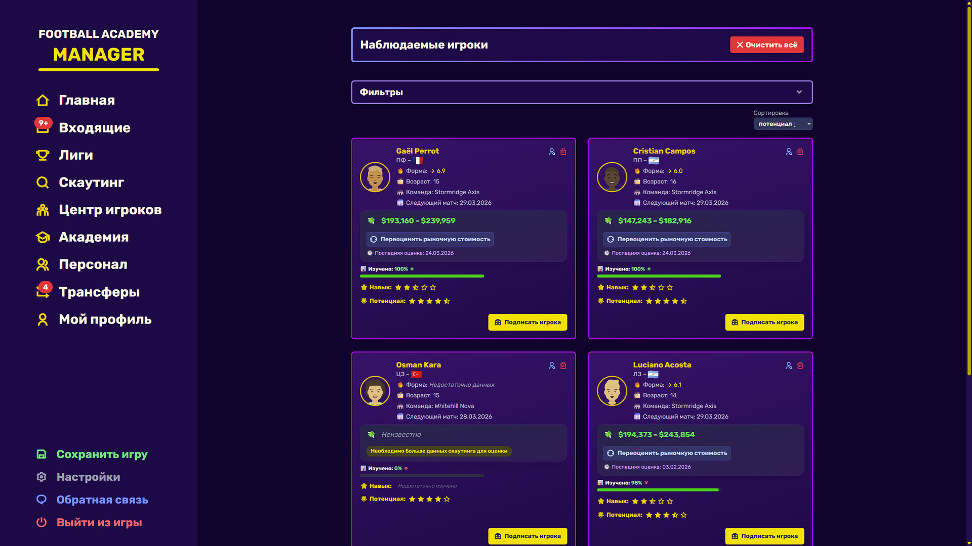• Продажа игроков — выпускай воспитанников в заинтересованные клубы и финансируй новую волну.