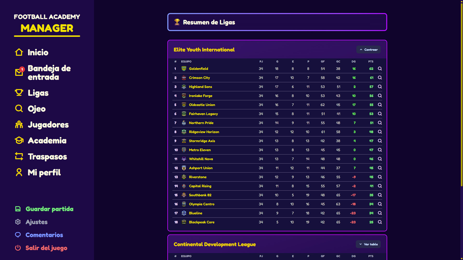 • Vende jugadores — coloca a los graduados en clubes interesados y financia la siguiente hornada.