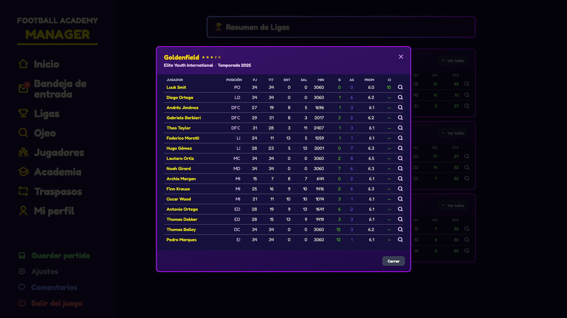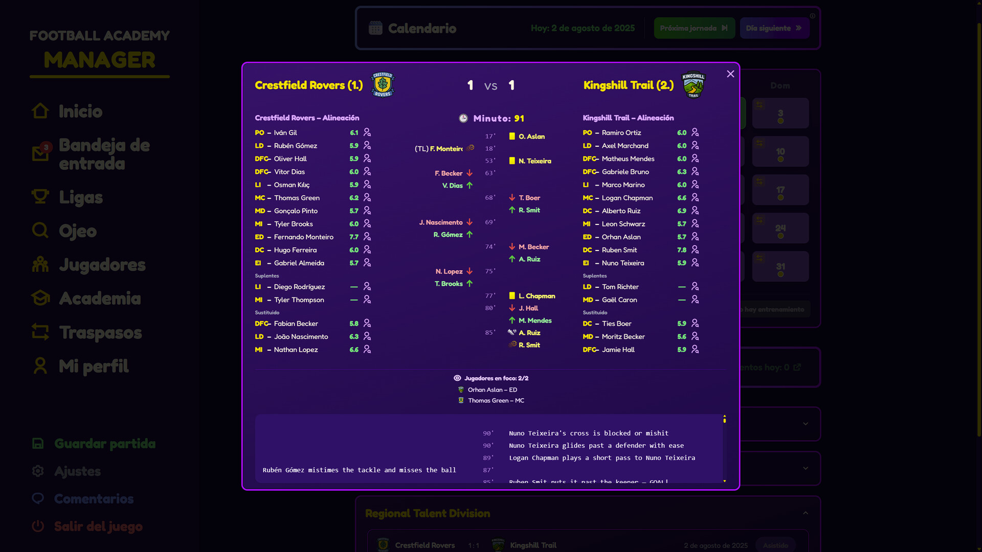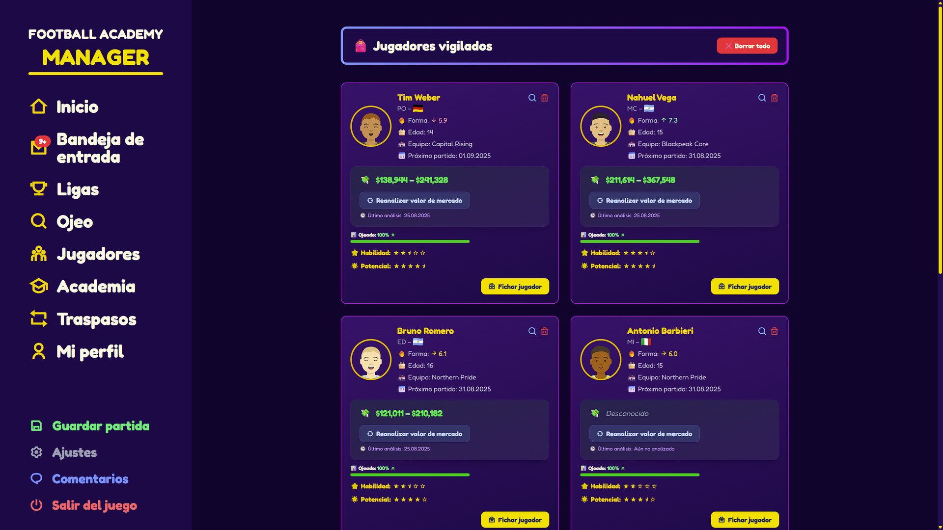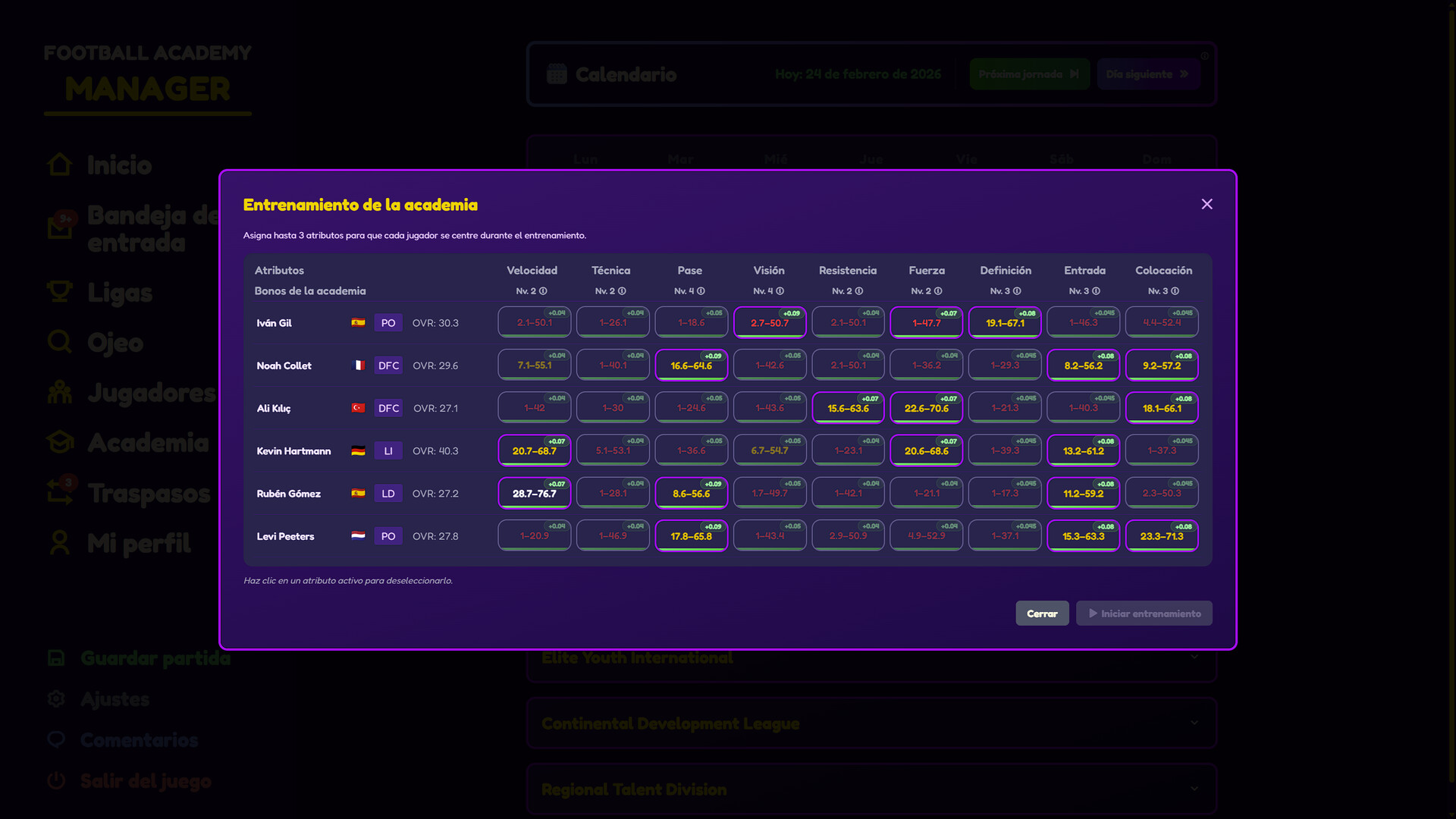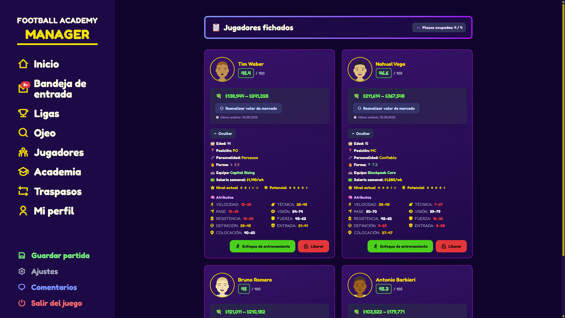 El desarrollo es dirigido. Marcas el foco, sumas minutos y ves avances constantes a lo largo de las temporadas. Cuando toca, vendes — movimiento limpio que financia el siguiente fichaje y mejora.