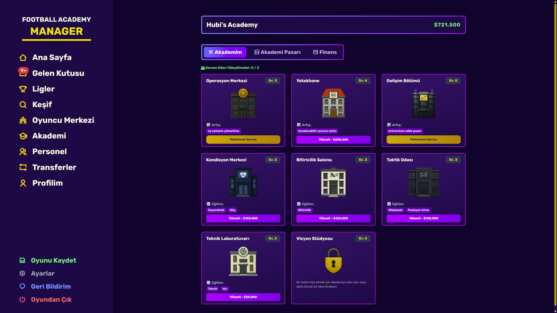 • Akademi yükseltmeleri — tesisleri geliştir, gelişimi hızlandır ve prestijini artır.