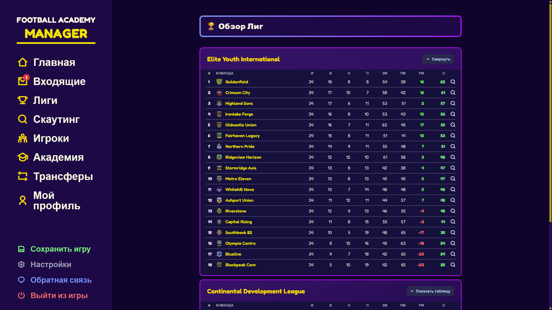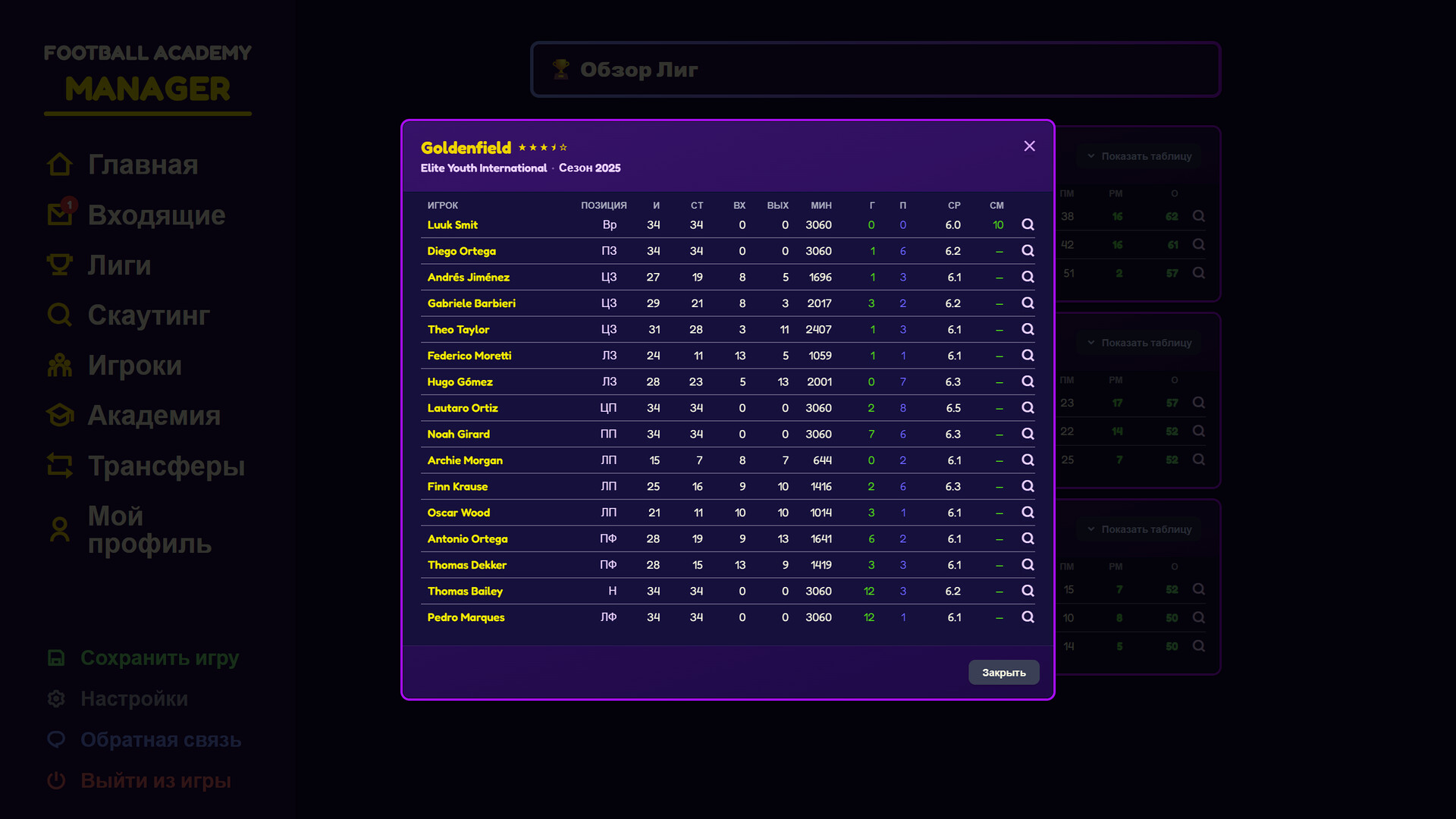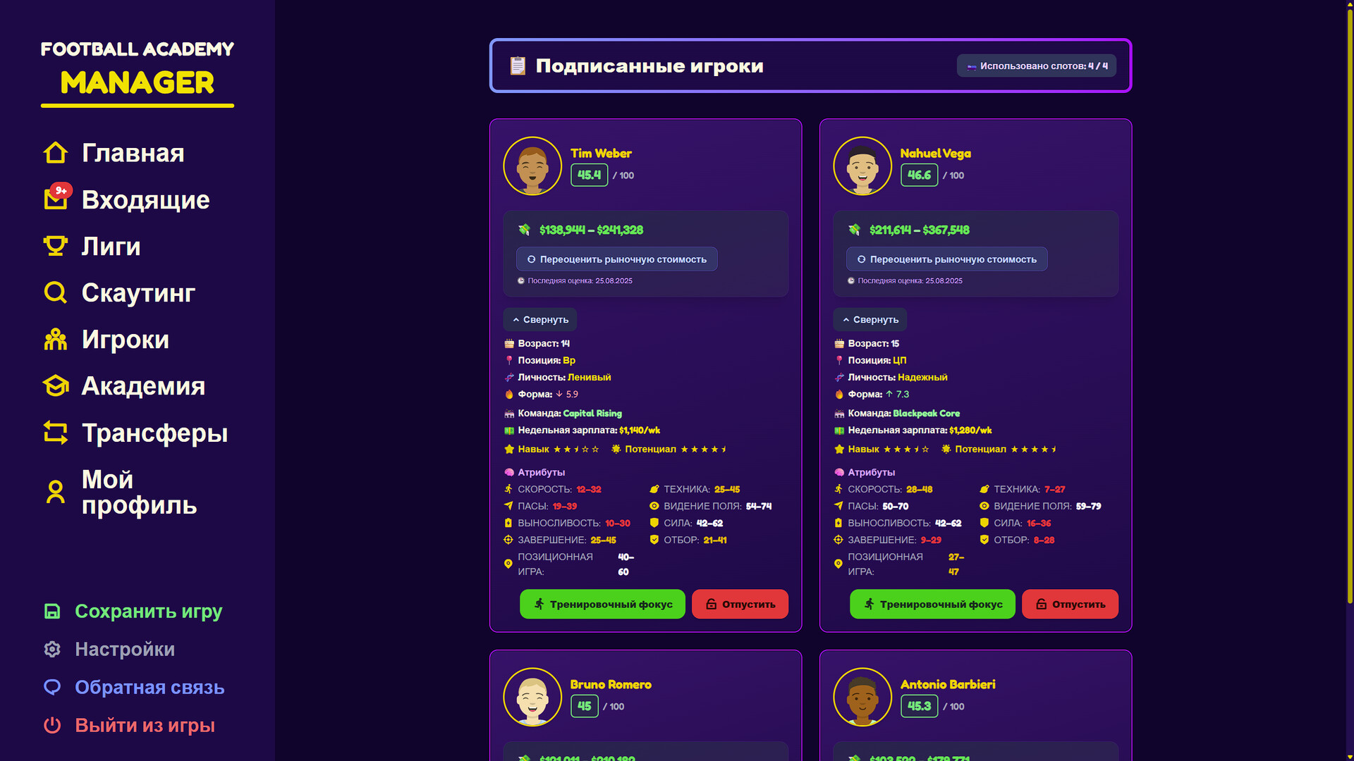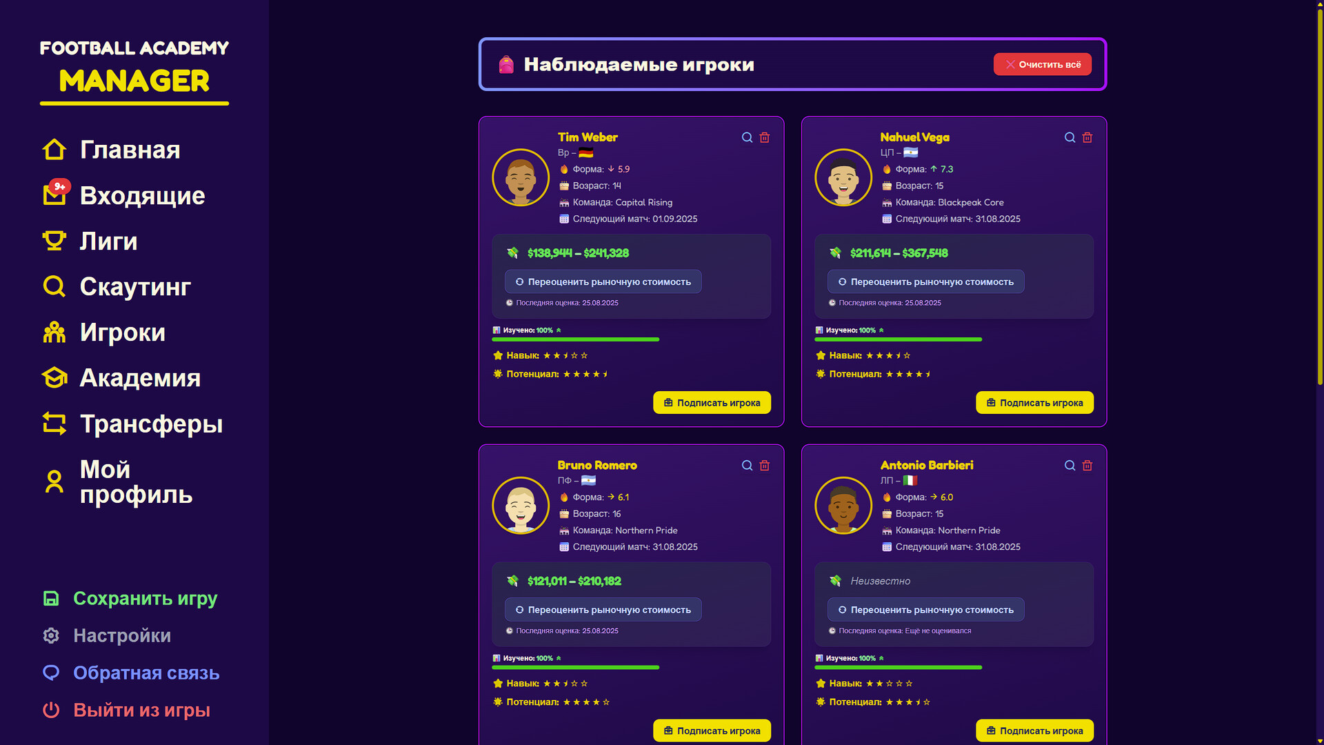 • Продажа игроков — выпускай воспитанников в заинтересованные клубы и финансируй новую волну.
