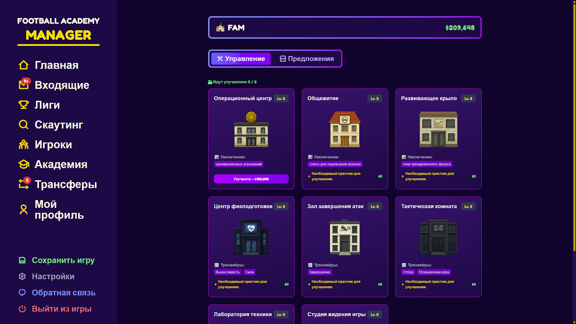 • Улучшение академии — прокачивай инфраструктуру, ускоряй развитие и поднимай престиж.