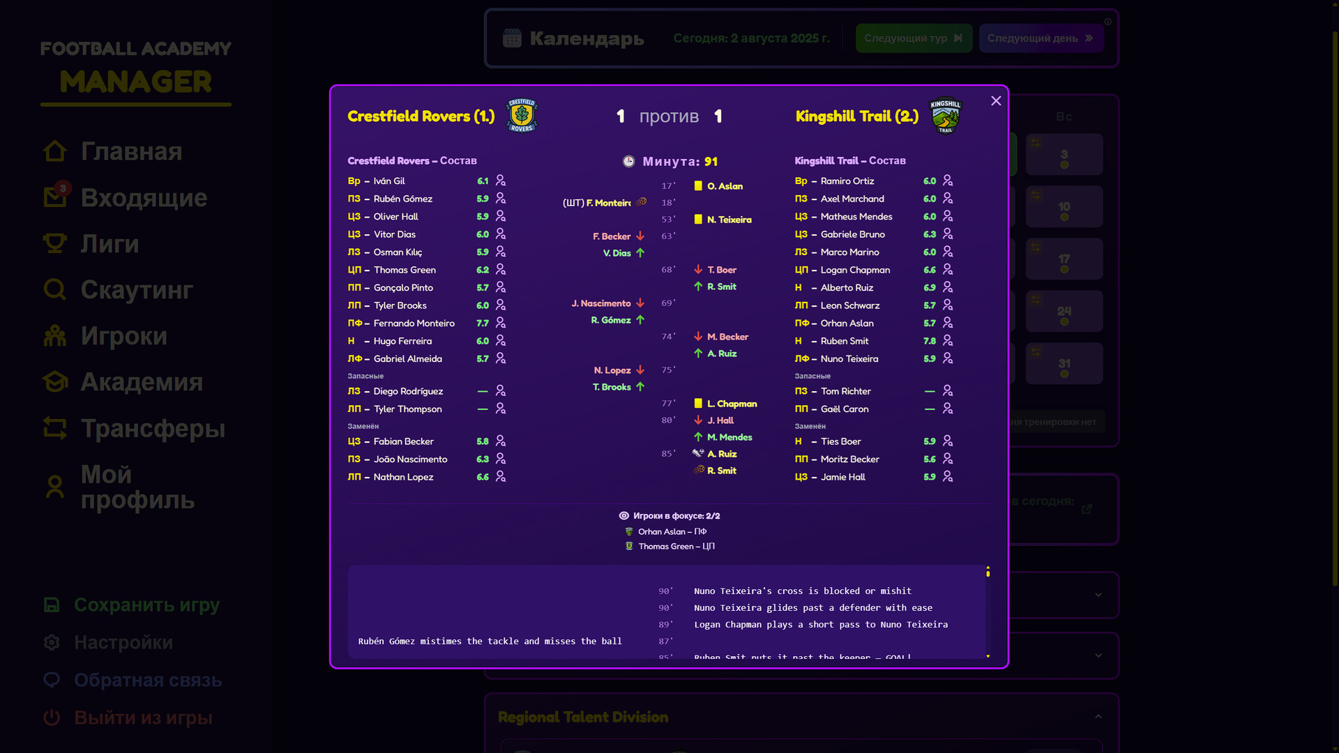 Ты наблюдаешь юношеские матчи, открываешь реальные способности, подписываешь подходящих, тренируешь по чётким направлениям, улучшаешь базы и реинвестируешь через трансферы. Каждое решение ведёт к следующему.
