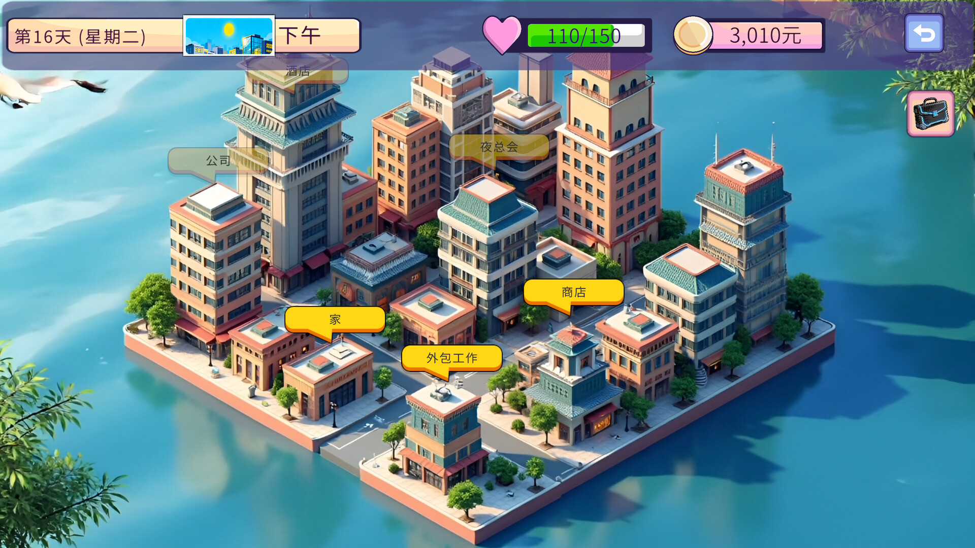 This game is a single-player simulation management game centered on schedule management and character interaction. The player takes on the role of the protagonist and progresses through the game loop of "work to earn money → spend on leisure → interact with characters → grow and develop."