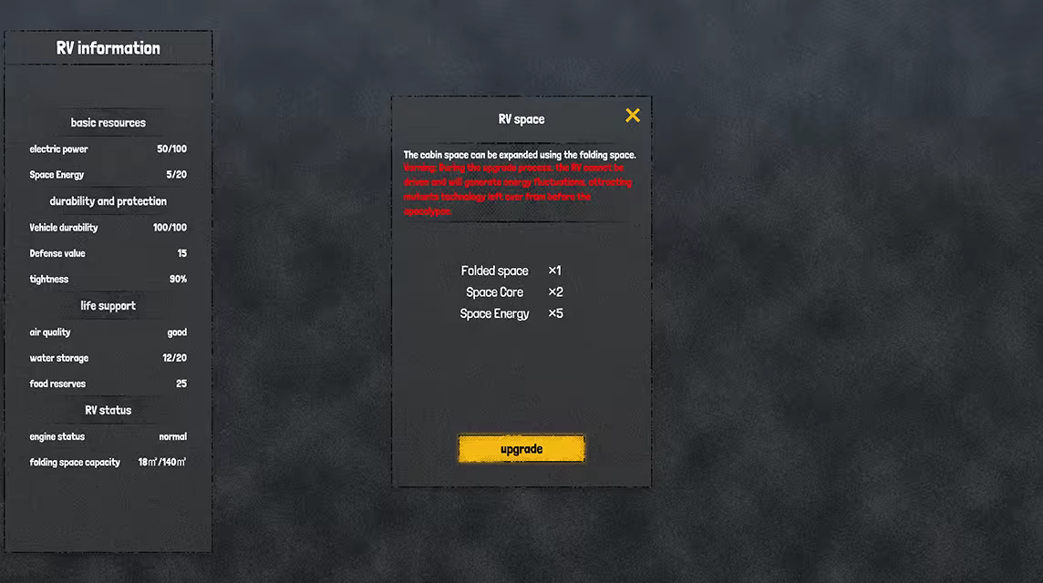 Your RV is more than a vehicle — it’s a mobile base with expandable folded space. Inside, you can plant crops, raise animals, craft equipment, and build living or defensive facilities.