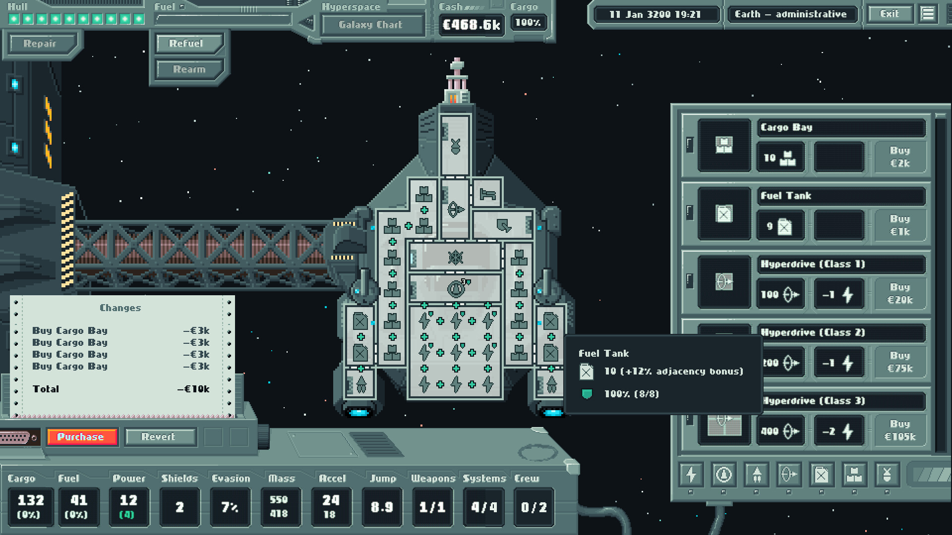 • Ship Design - Build your starship your way and change its configuration to balance, attack, defence, speed, cargo capacity and jump range or buy new larger starships