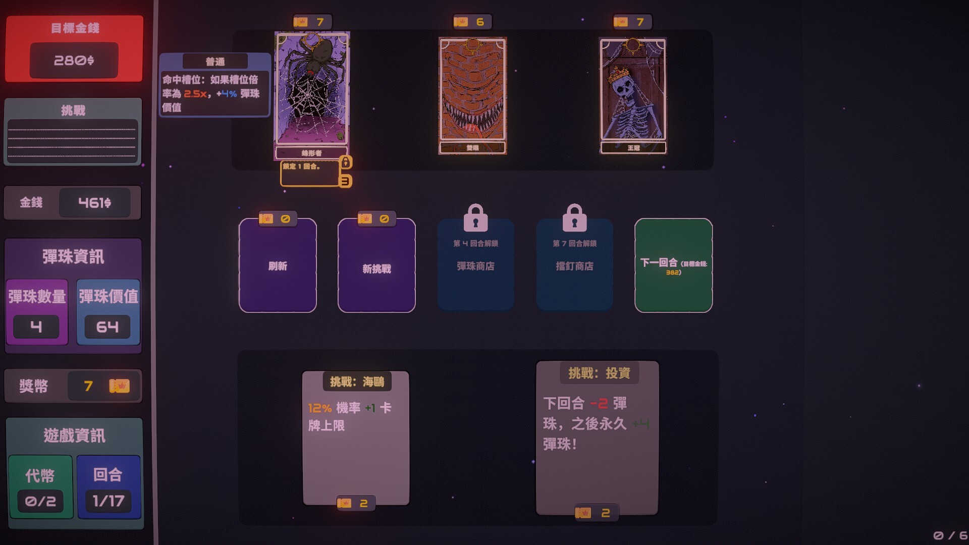 存錢還是買卡?保留還是出售?擴充彈珠數量或提升單次價值?每個決策都牽動戰局。巧妙調配資源、最佳化卡組搭配,在有限的掌控中最大化收益——畢竟,這是你手中唯一緊握的籌碼。