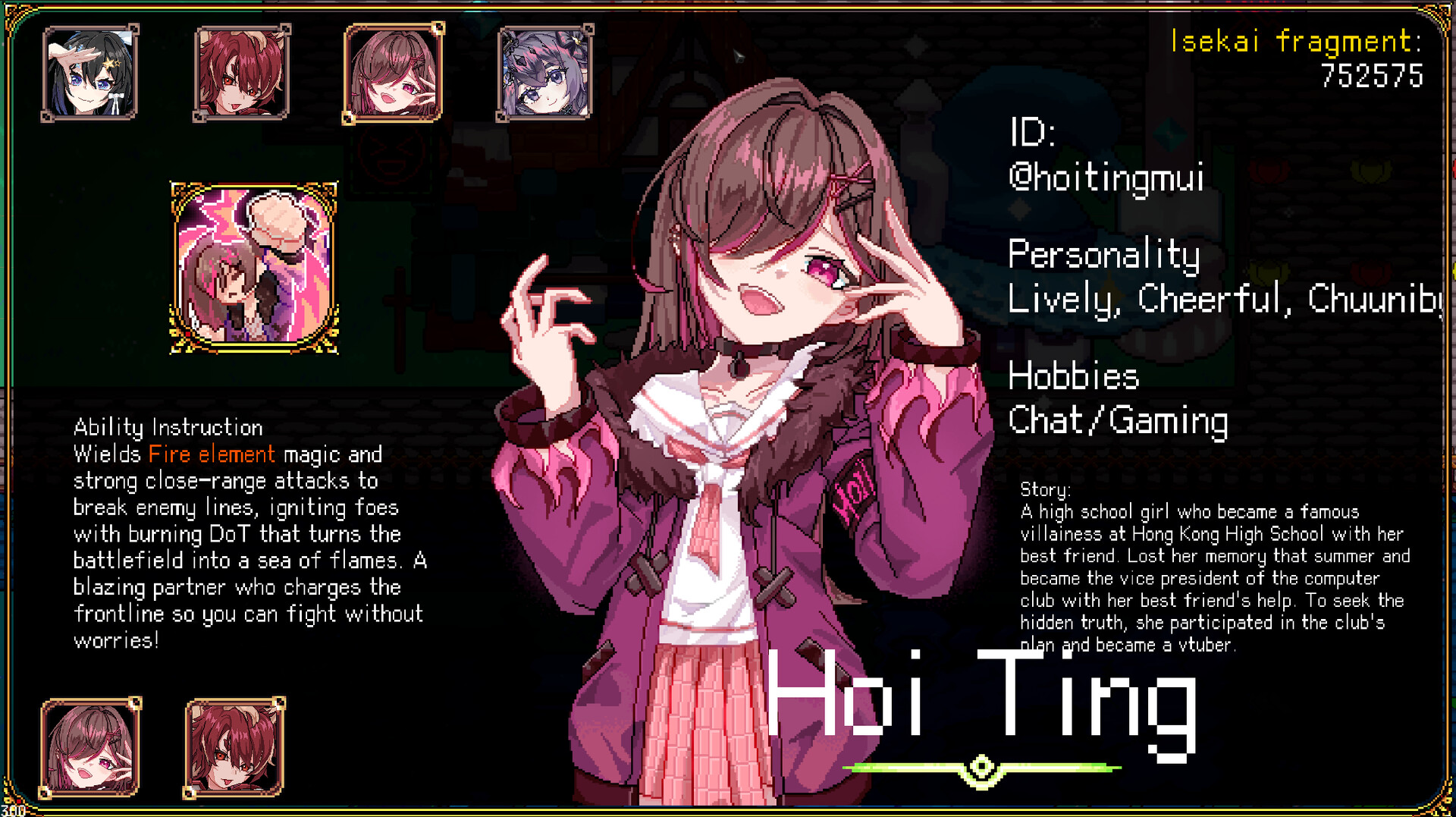 "Isekai HKV" is a 2D pixel-style Roguelike game themed around Vtubers traversing to another world. Players will take on the role of the hero "DD," entering a forest filled with spatial distortions, fighting alongside companions against endless waves of enemies and defeating the demon king.