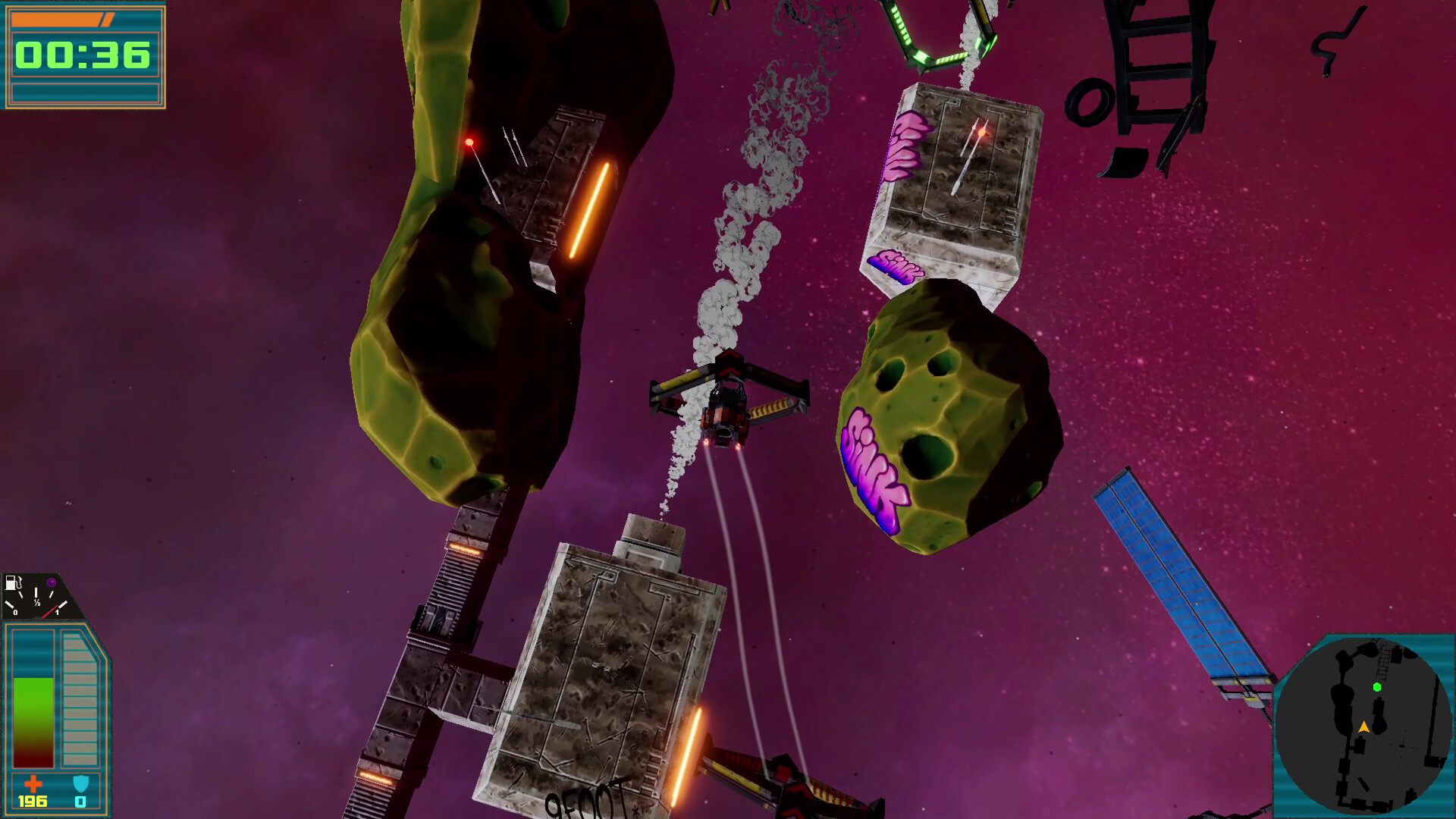 • From Scrap to Ship: You start with a basic bucket of bolts. Spend your hard-earned credits on weapon systems and high-tech gadgets to turn your pod into a dealer of neon-tinted death.