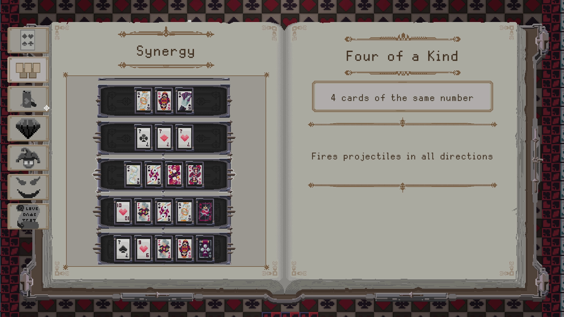 Equip playing, tarot, and hanafuda cards into your Deckloader, arrange them into hands, and watch your firing rules change in real time. A new card can turn your weapon into homing shots, piercing lines, bouncing bullets, orbiting projectiles, splitting fire, or an entirely different combat rhythm.