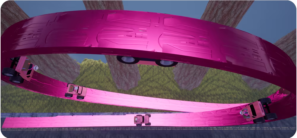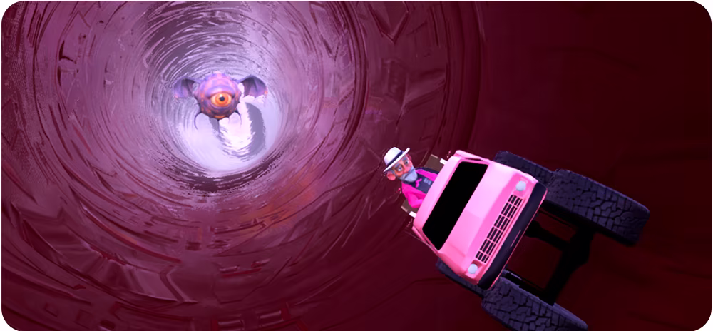 Massive cylindrical roads where your vehicle is magnetized to the surface. Rotate around the structure while moving forward, crushing cancer, avoiding rotating spike balls, and targeting enemies both on and off the road.