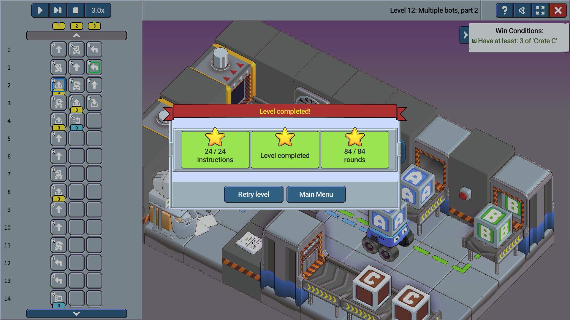8-bitBot is a programming puzzle game where you place simple instructions in a program to make your bots transport objects in a factory environment.