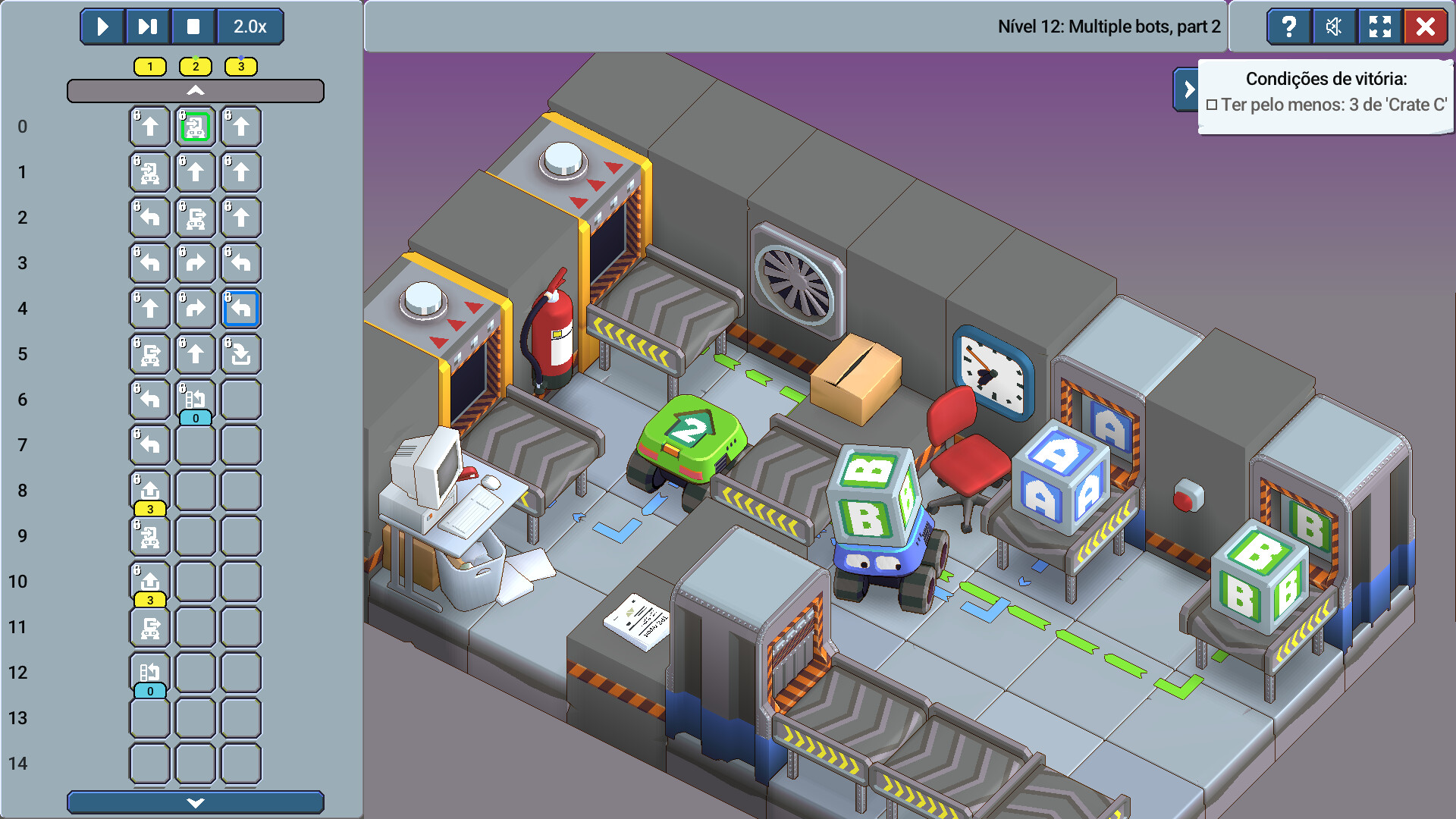 8-bitBot é um jogo de puzzle de programação onde colocas instruções simples num programa para fazer os teus bots transportarem objetos num ambiente de fábrica.