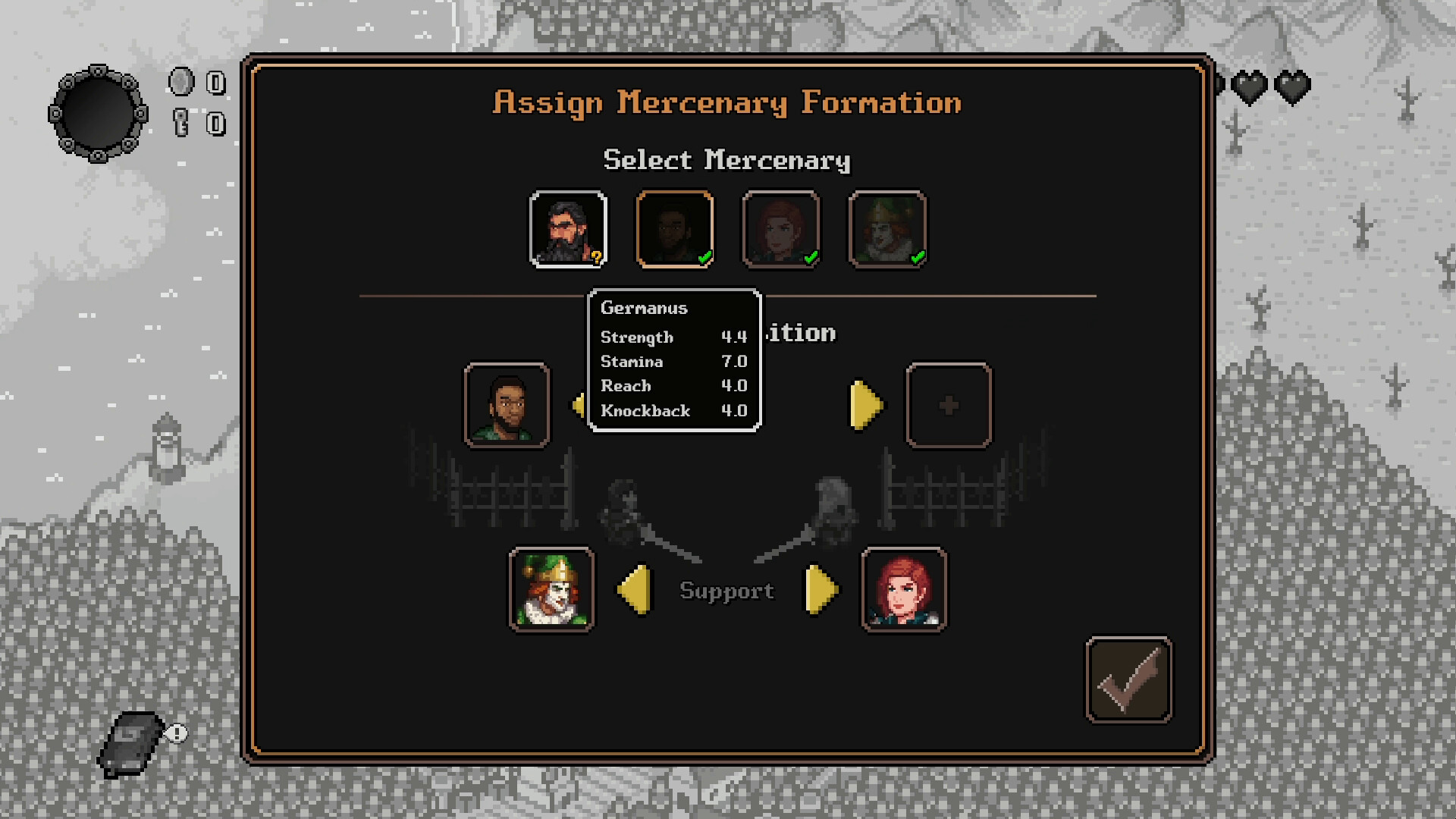 Some areas may have mercenaries for hire. If you have the gold you can add them to your team to increase your odds! Four mercenaries are available to find in the demo, each with their own unique support abilities.