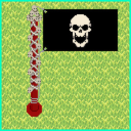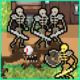 Pixel art–styled skeletons perform human sacrifices to harvest souls. The skeletons engage in combat against villagers within a rural settlement.