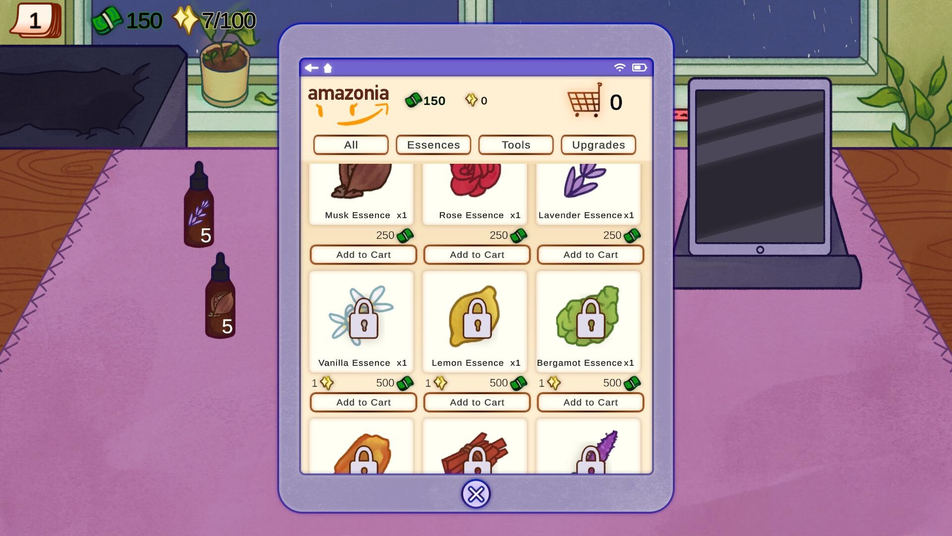 Choose from a wide library of essences, each with its own traits. Mix and match to create perfumes that carry distinct moods, accords, and tones. Every drop counts, so use your ingredients wisely.