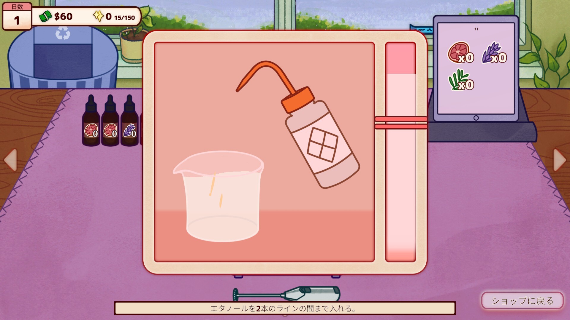 調香は芸術であり、同時に繊細な技術でもある。香料を加える順番、溶剤の比率、温度管理、攪拌のタイミングと頻度…ほんのわずかな誤差が結果を大きく左右する。細部にまで心を配り、数々の挑戦を乗り越えて、理想の香水を作り上げよう!