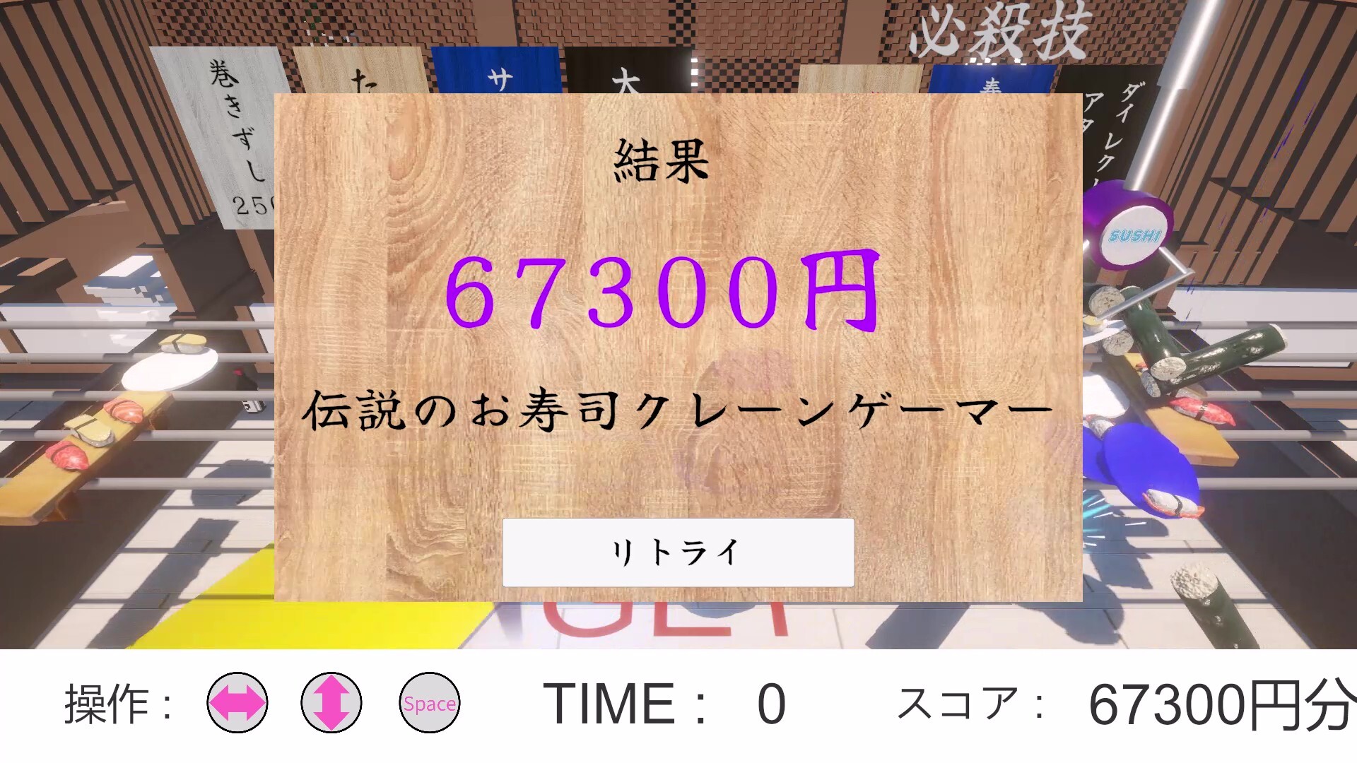 リアルな物理演算で再現されたアームを操作し、レーンを流れる色とりどりの寿司掴み取ろう!獲得した寿司の値段が加算され、あなたが食べた寿司の合計金額がスコアになります。