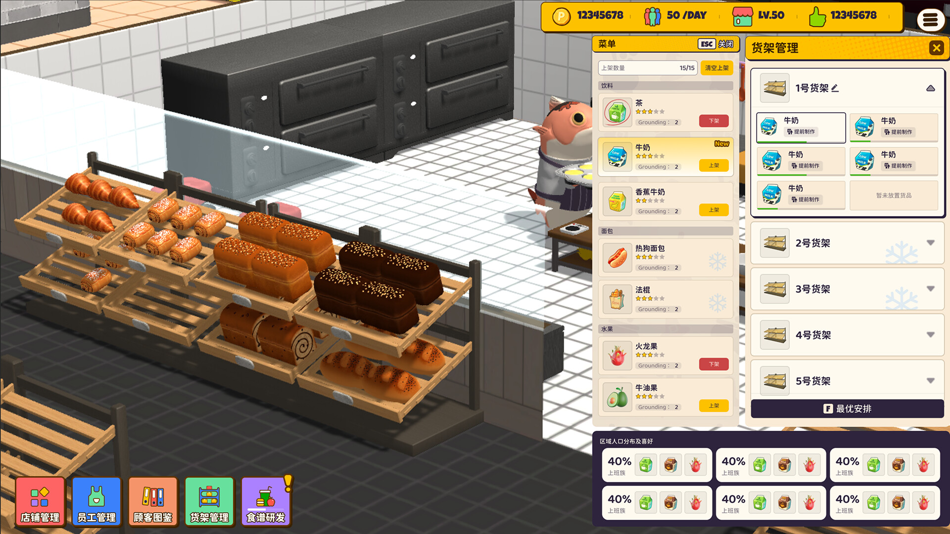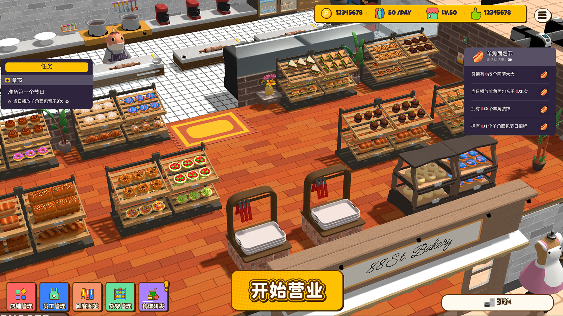 沉浸式体验烘焙工坊经理的日常:招募并培训个性员工,研发美味新配方,扩建店铺规模,策划广告宣传,升级烘烤设备,将各式糕点和面包摆满货架,并用精心挑选的装饰打造独特风格。你的终极目标?让每一位顾客都能获得难忘的体验。