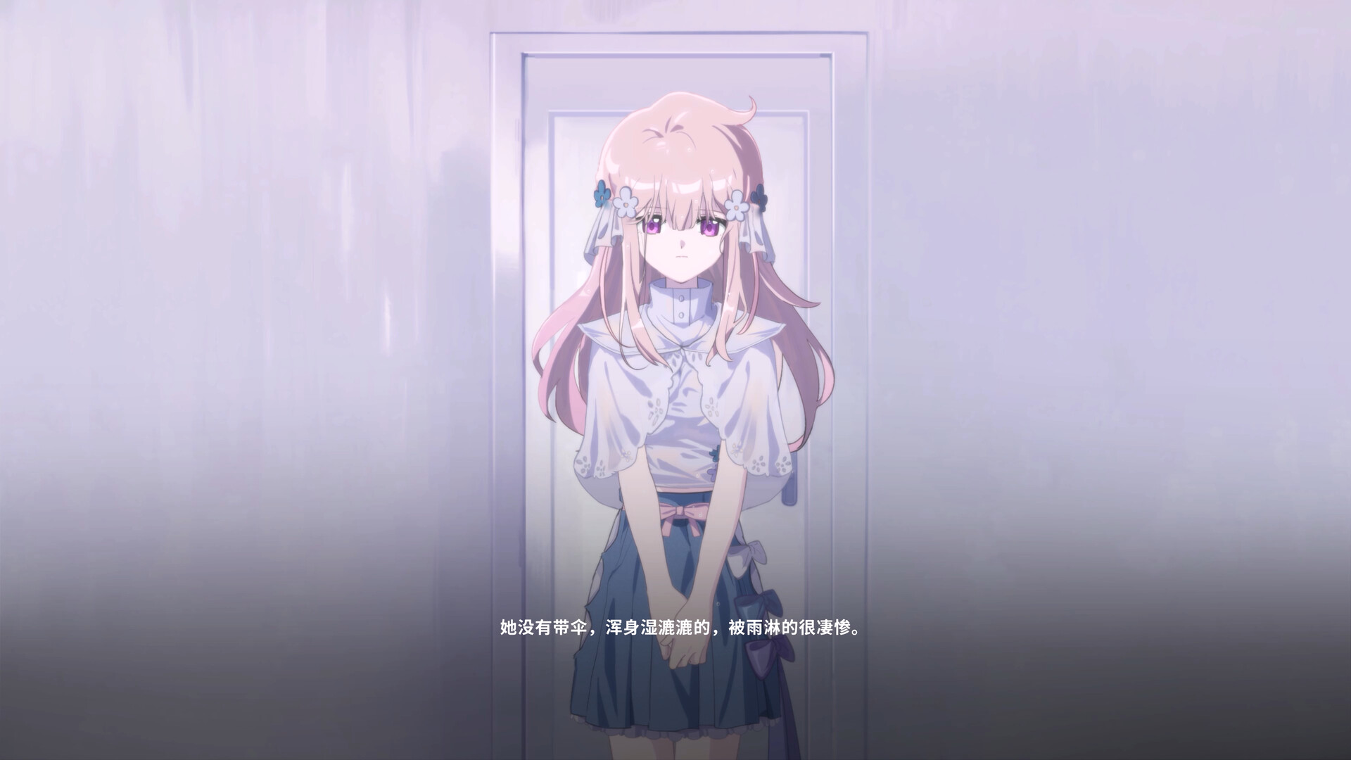 A deceptively serene, pink-haired girl in white.