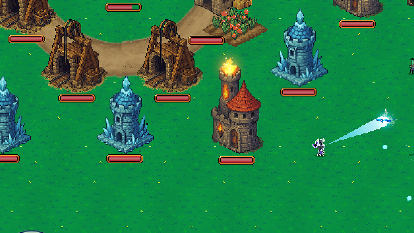 Build a town and keep it secure! Enemies approach from all directions, do you have what it takes to stop them? Stroll through town, set up buildings to produce resources, then use those resources to put up defense towers. With a growing collection of towers, bring the fight directly to your enemies. Collect experience points when you defeat enemies, and Level Up to choose bonus abilities.
