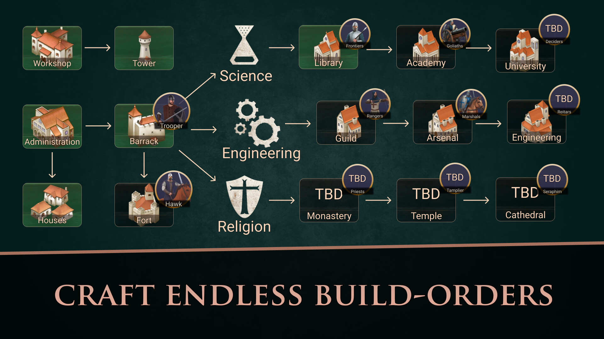 Multiple development paths within each faction offer countless combinations of warriors and technologies. Will you focus on overwhelming cavalry charges, impenetrable defensive lines, or devastating siege warfare? Each choice shapes your civilization's identity and opens unique strategic opportunities.