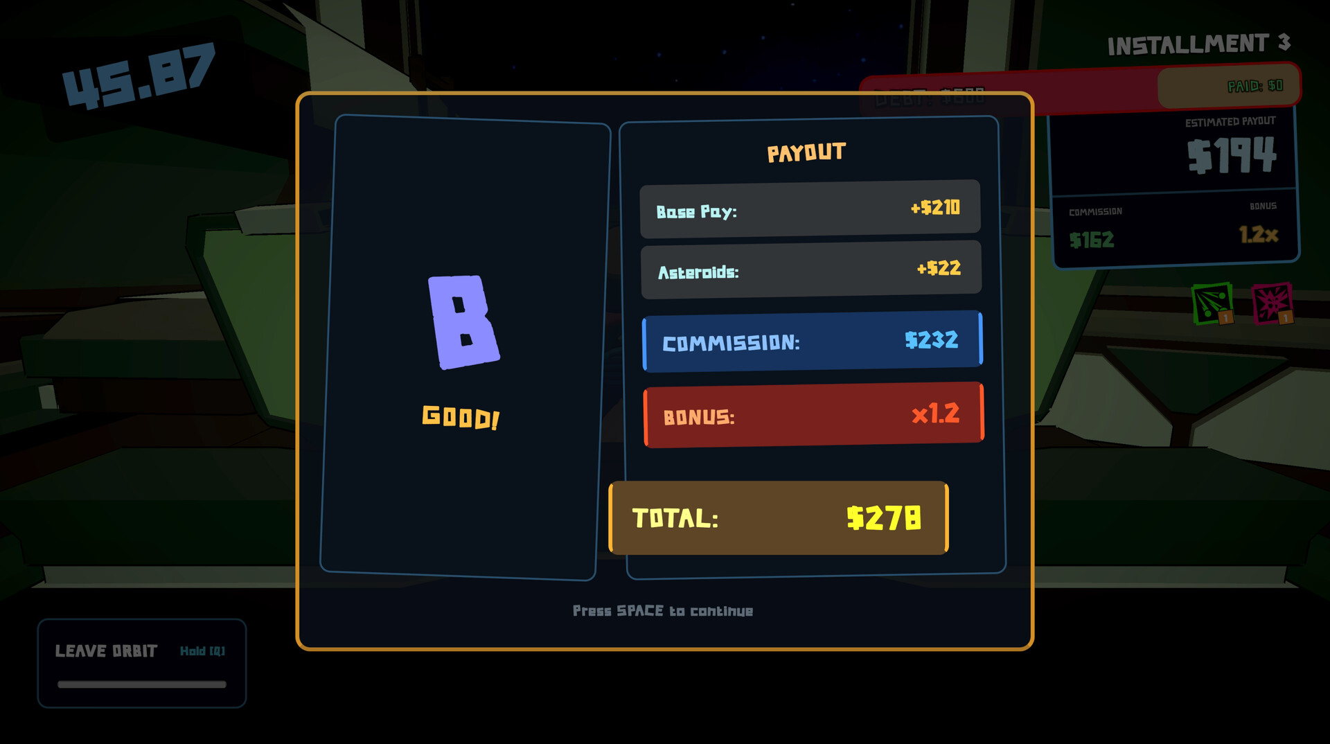 • THE BONUS: The multiplier on your commission. Grazing asteroids, attacking the space cops, any risky action will add to it.