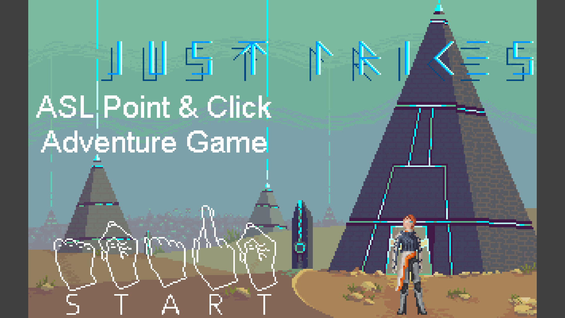 A futuristic Sci-fi Point-and-Click Adventure Game with American Sign Language animations, everything in pixelart style.