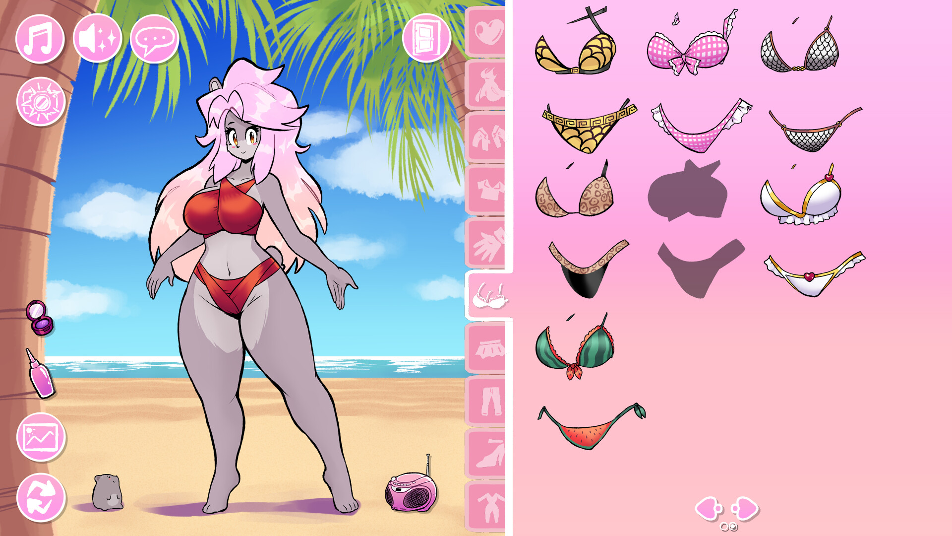 The Bikini Variety Pack adds a new page to the underwear/swimsuits tab, giving you 7 additional bikinis for Helene to wear and mix with other items.