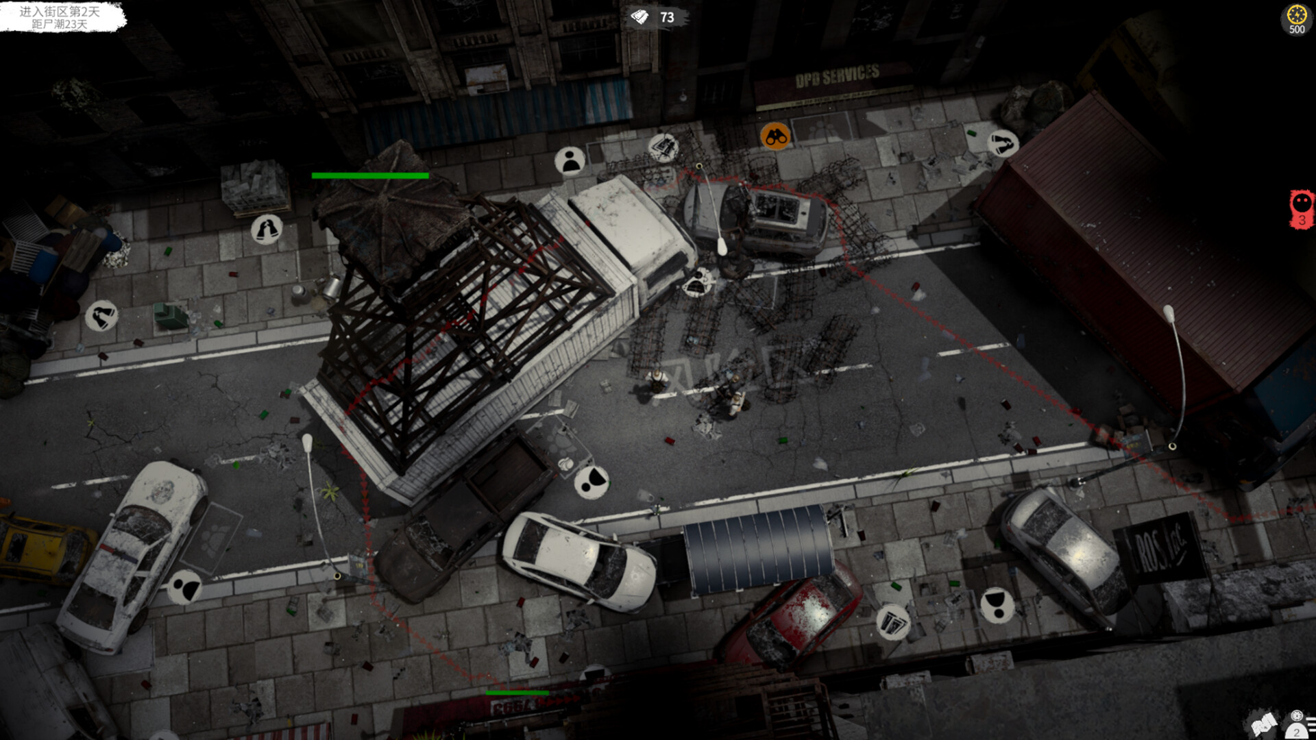 Beyond the regular nightly assaults, periodic zombie tides threaten to overwhelm your defenses. Evacuate districts before these massive hordes arrive to ensure your group's survival.