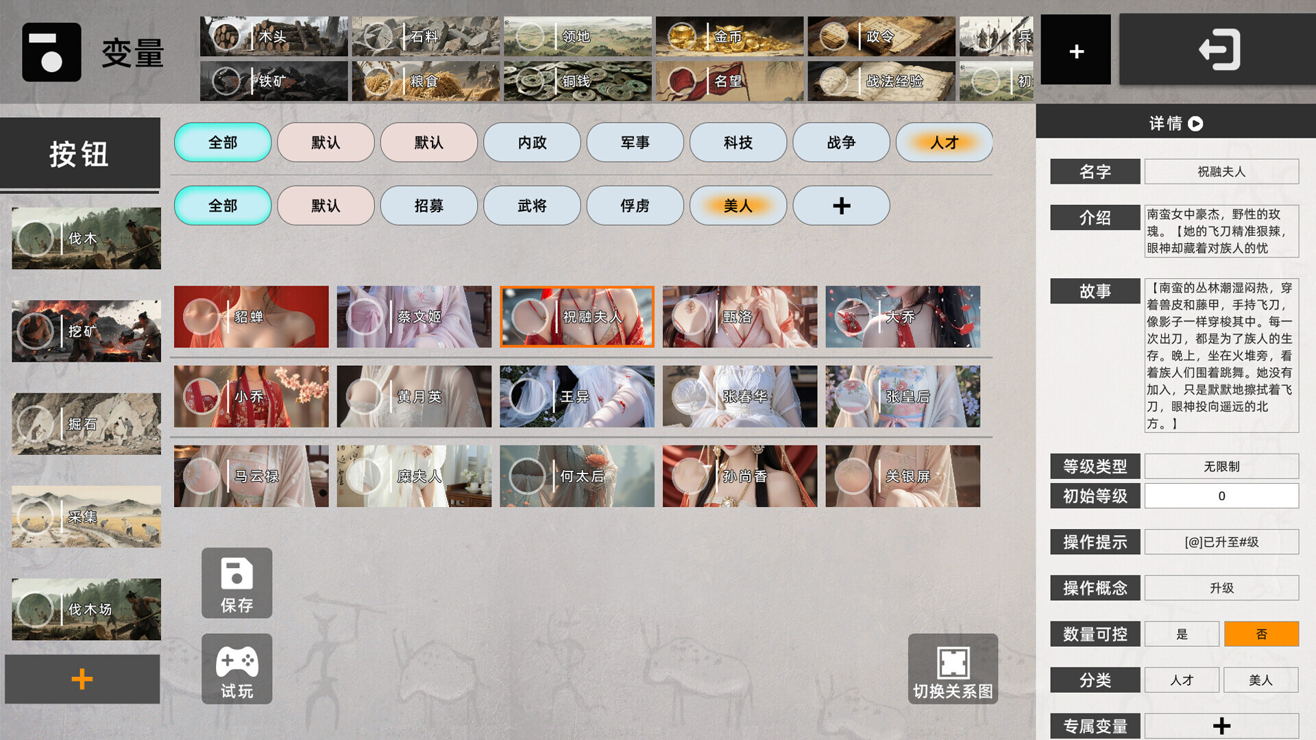 在創世的玩法中,您可以建立一個屬於自己的世界!您可以為遊戲新增各種功能模組,新增各種資源,設定每個互動模組的詳細功能以及背後的互動邏輯,新增各種角色及圖片和故事背景,新增各種遊戲劇情!您可以在視覺化的關係圖中輕鬆編輯遊戲中的一切!