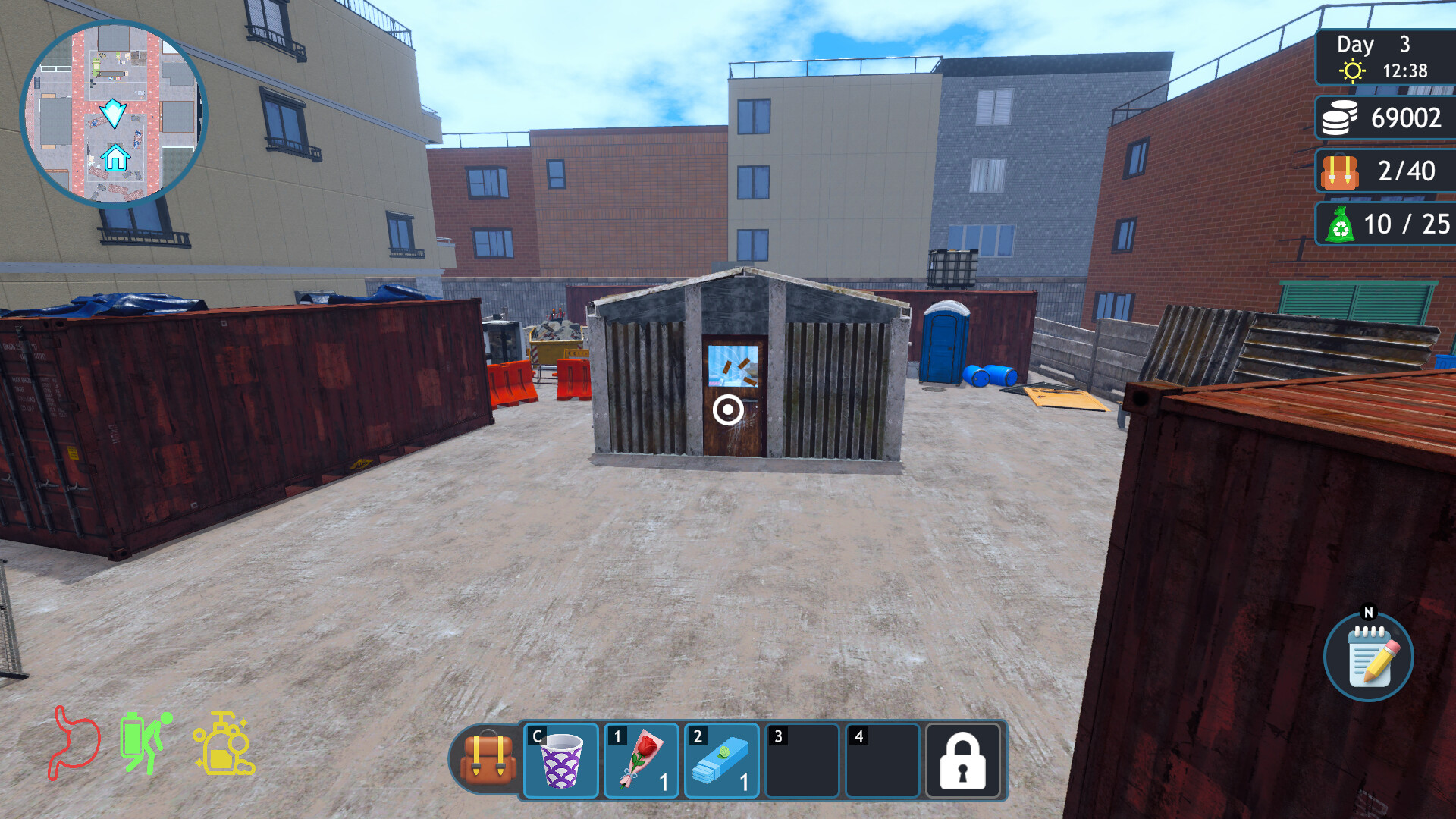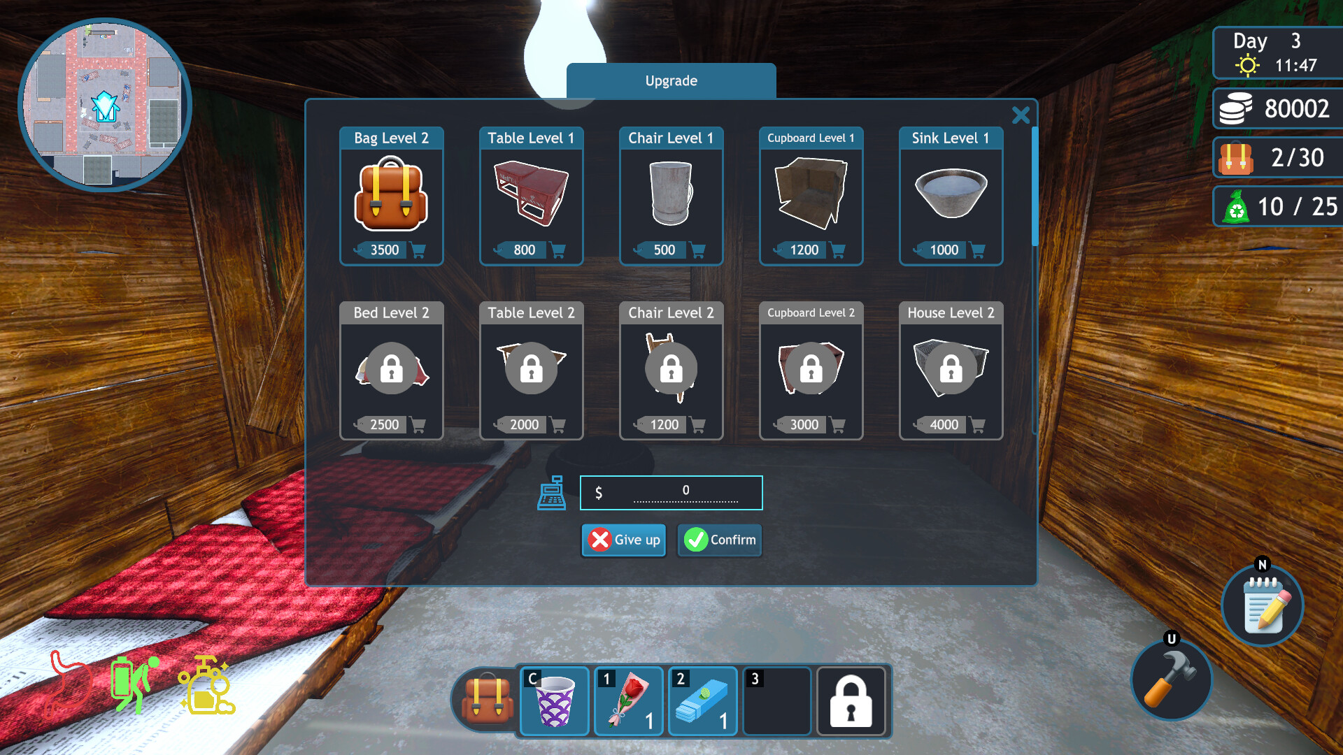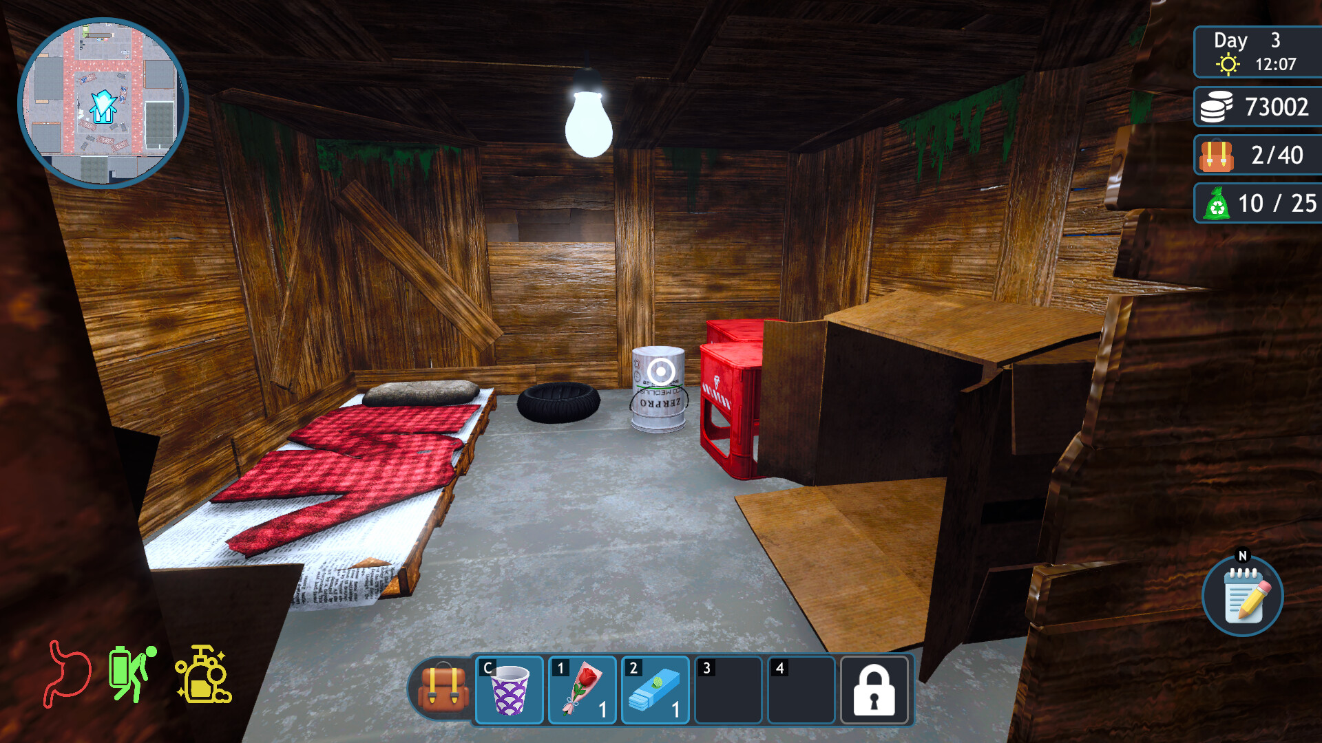 By night, return to your shabby shelter — rest, store your items, and slowly turn your broken shack into a safe, livable home.