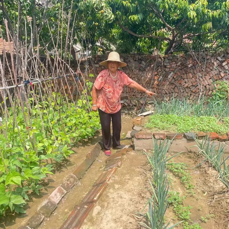 A warm moment of an old lady in her vibrant little vegetable garden. As the absolute focus of the scene, she is wearing a wide brimmed straw hat, a red short sleeved shirt decorated with pink and white patterns, dark pants, and a pair of pink shoes, with a kind and joyful smile. She was extending her arm and pointing towards the crop on the right side of the screen, as if proudly showcasing her labor or sharing the joy of planting with others. The background of the picture is a low wall made of irregular red bricks, with lush trees visible behind the wall. The branches are covered with green fruits, possibly peaches or plums. On the left side of the vegetable garden, on which vines climb, showcasing the wisdom of rural life.