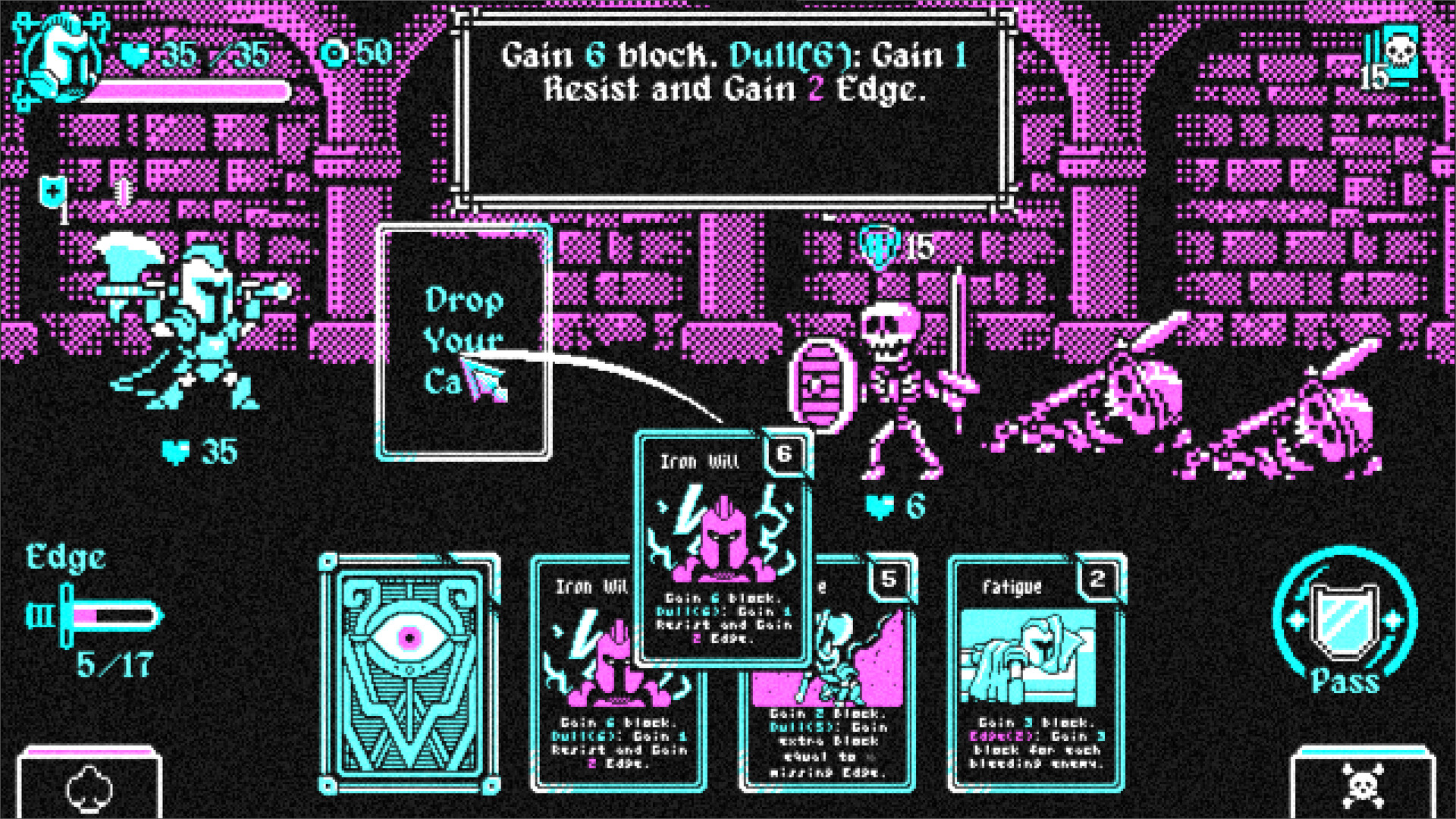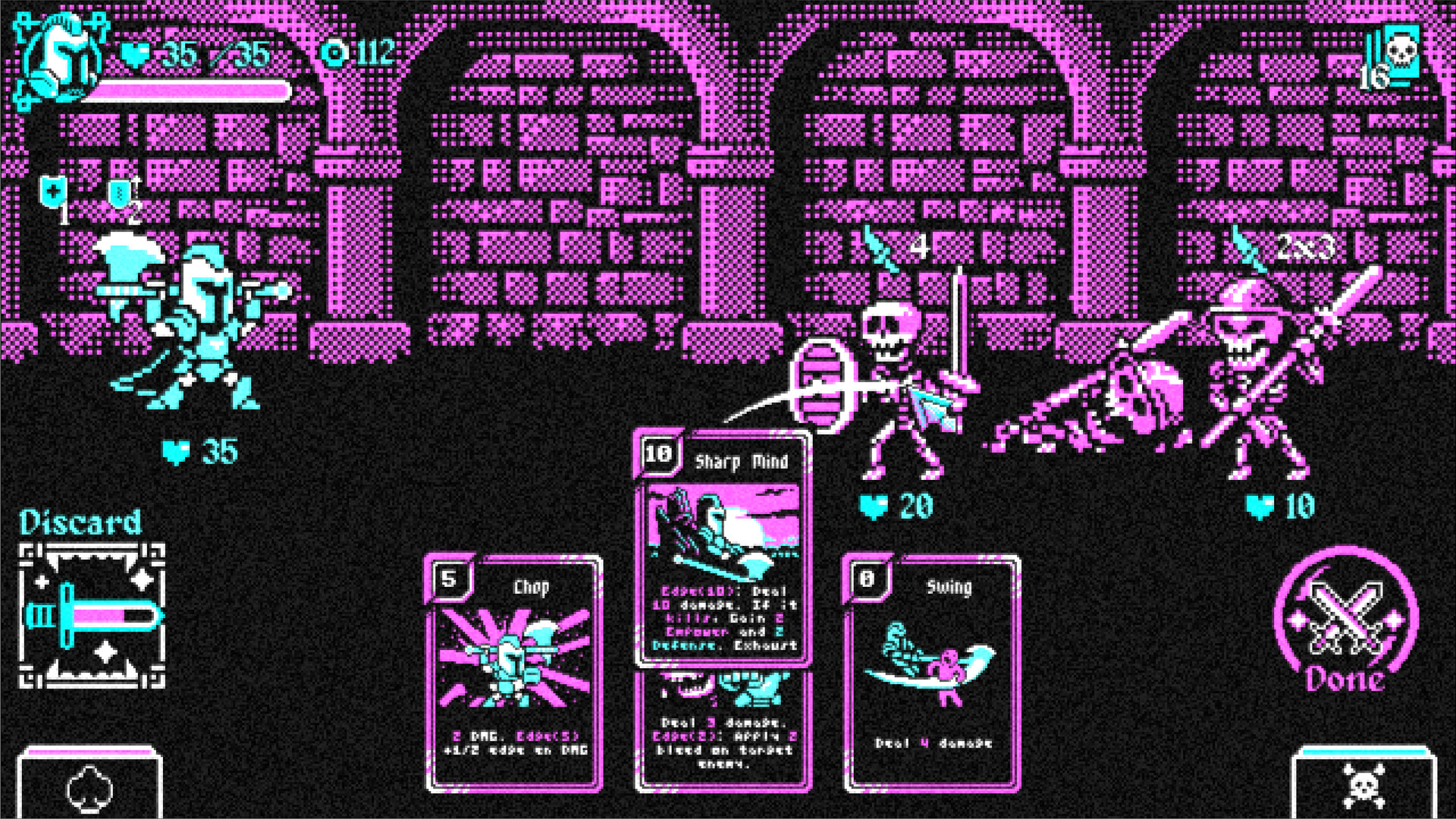 A retro 8-bit deck builder roguelike with '80s vibes, where you can not only customize your deck and weapons, but you can also choose to use your cards in attack mode or defense mode!
