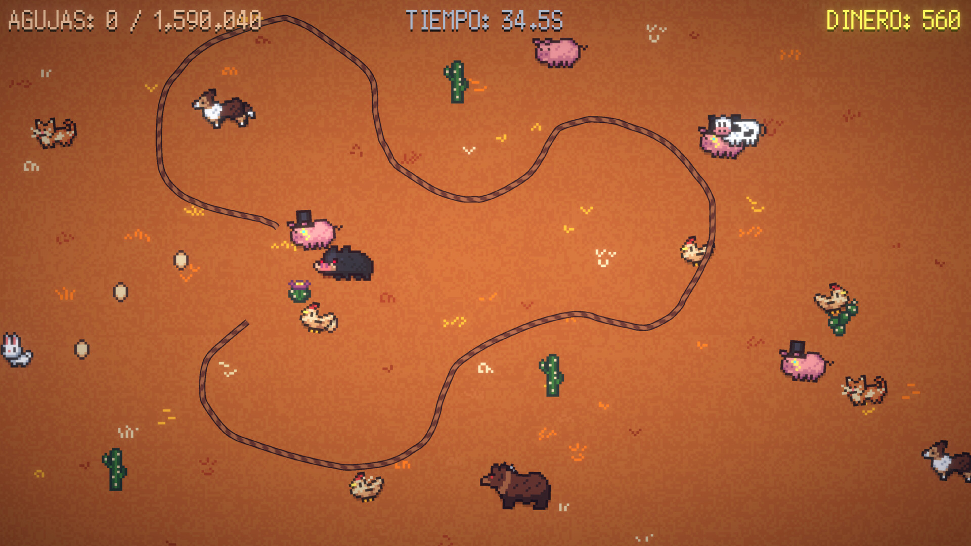 Si aún no te convences, quizás el pintoresco pixel art dibujado a mano, la pegadiza banda sonora de bluegrass o los tristes ojos suplicantes de los animales de la granja sean suficientes para conquistarte. ¡Ata a tu ganado, construye tu granero, supera los niveles de dificultad y descubre cuánto tiempo sobrevives en Wrangle Ranch!