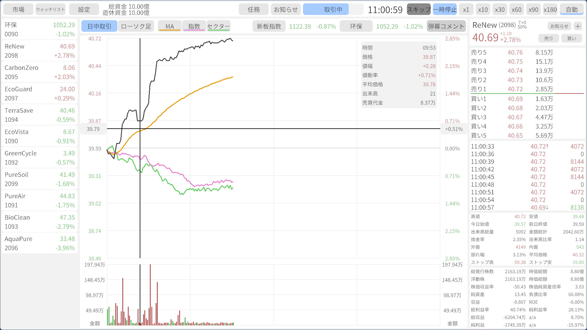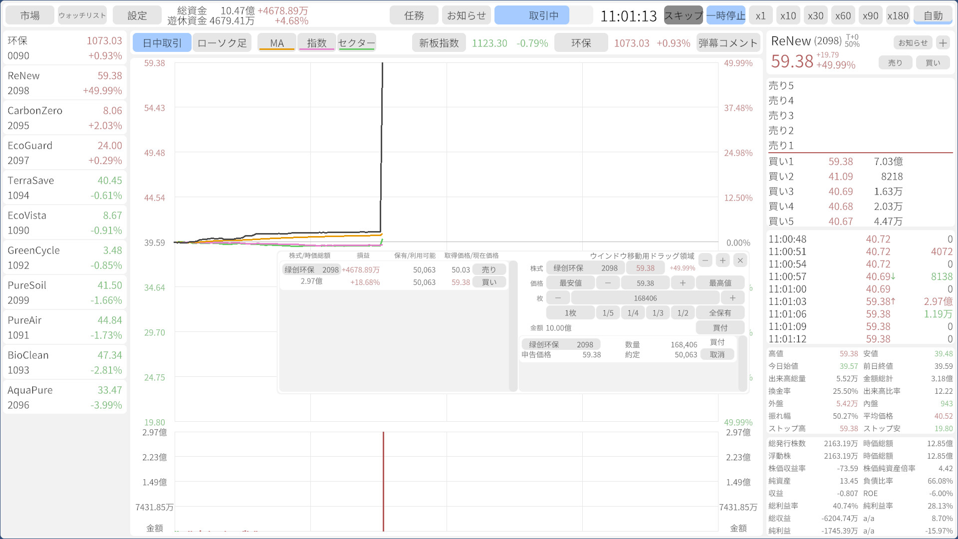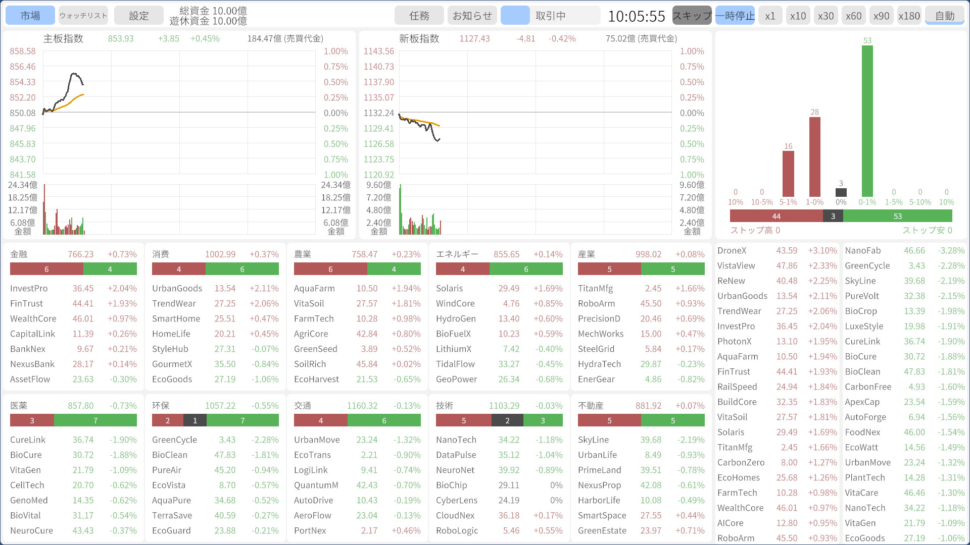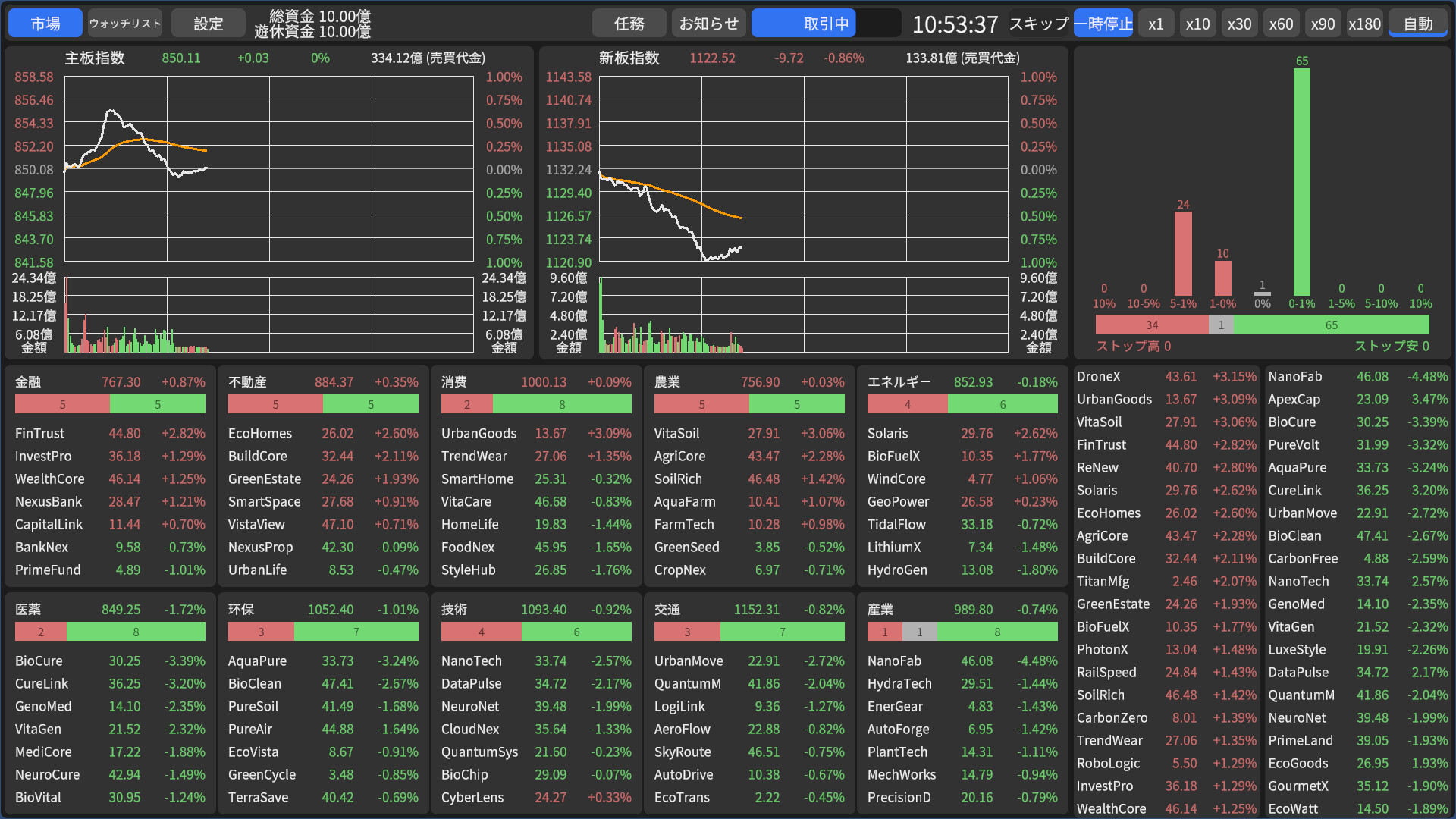 これは株式市場で大資本を動かす操作をシミュレートするゲームです。発表情報、市場心理、セクターのトレンドを活用し、株式売買で利益を上げましょう。あなたは個人投資家から利益を搾取するマーケットメーカーになるか、それとも損失から救うヒーローになるか?