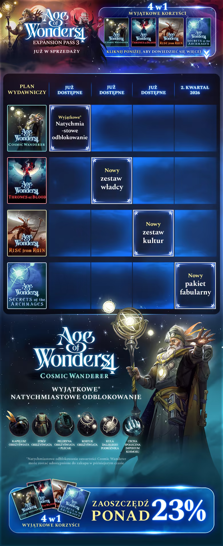 Zagraj w strategiczną grę fantasy, która nieustannie się rozwija i zmienia, ponieważ jest rozbudowywana na nowe sposoby przy użyciu serii odmieniających rozgrywkę rozszerzeń i pakietów treści. Przepustka Expansion Pass 3 do gry Age of Wonders 4 obejmuje: