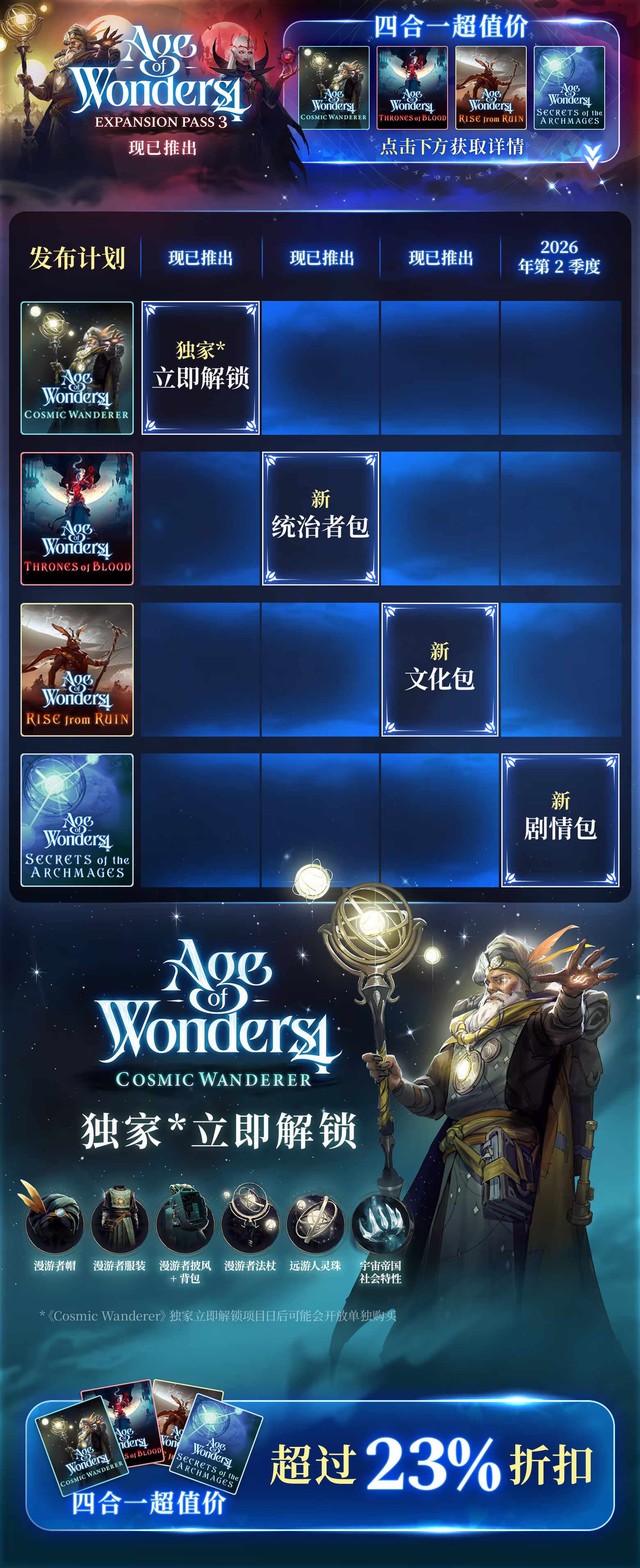 遊玩每回合都會成長和改變的奇幻策略遊戲,遊戲將能透過另一系列能大幅改變遊戲方式的新內容,以全新方式擴充既有內容。《Age of Wonders 4》Expansion Pass 3 包含: