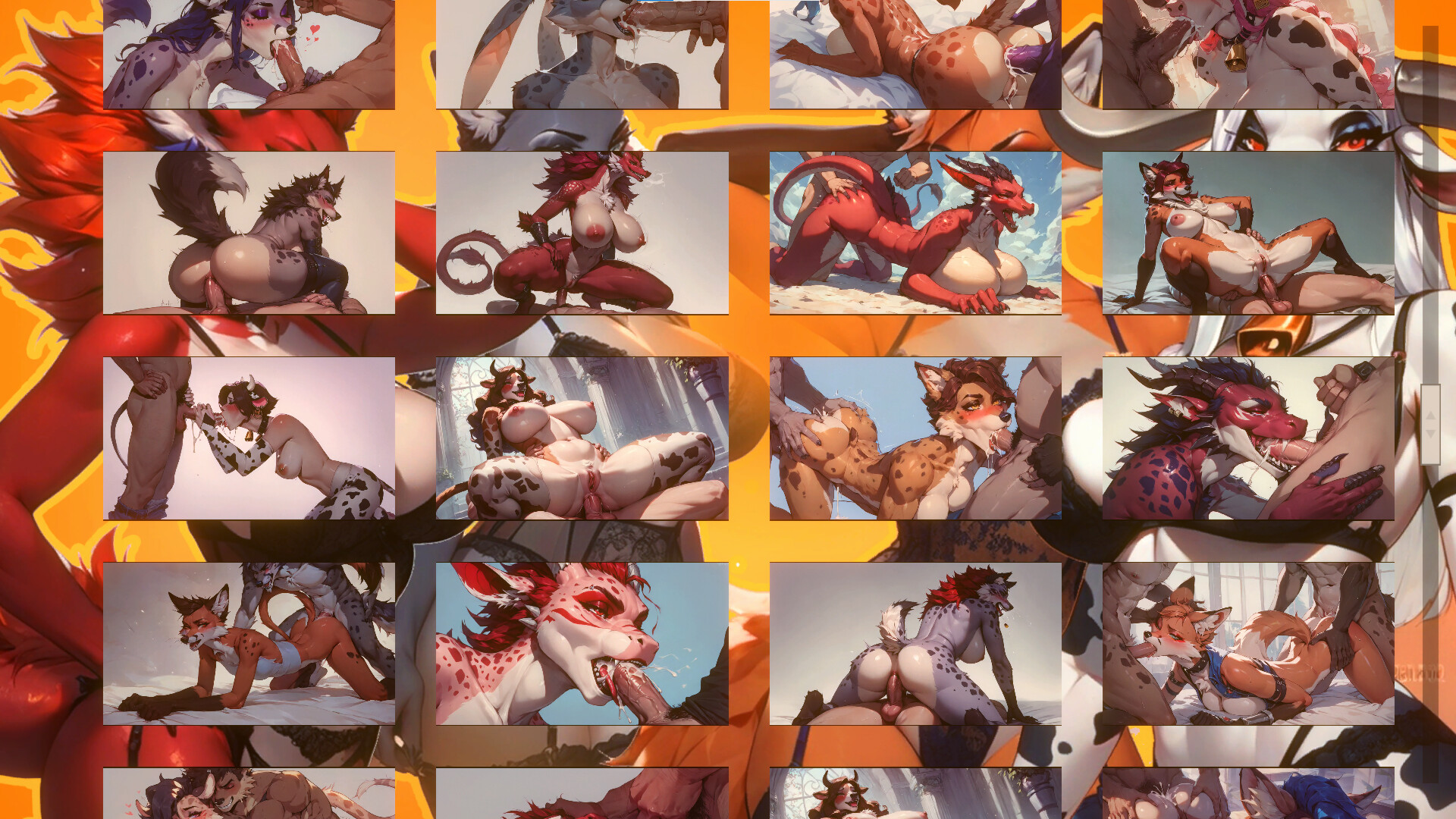 This game contains full nudity, explicit sexual acts, and anthropomorphic (furry) characters in adult scenes. All content is fictional, consensual, and features characters of legal age. No violent, non-consensual, or illegal themes are present.