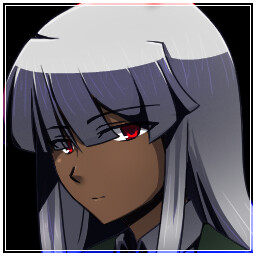 nyn, a teenage girl with sharp red eyes, dark skin and white hair