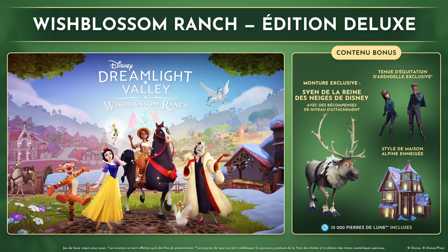 Disney Dreamlight Valley: Wishblossom Ranch - Édition Deluxe contient 10 000 pierres de lune et les items virtuels exclusifs suivants :
