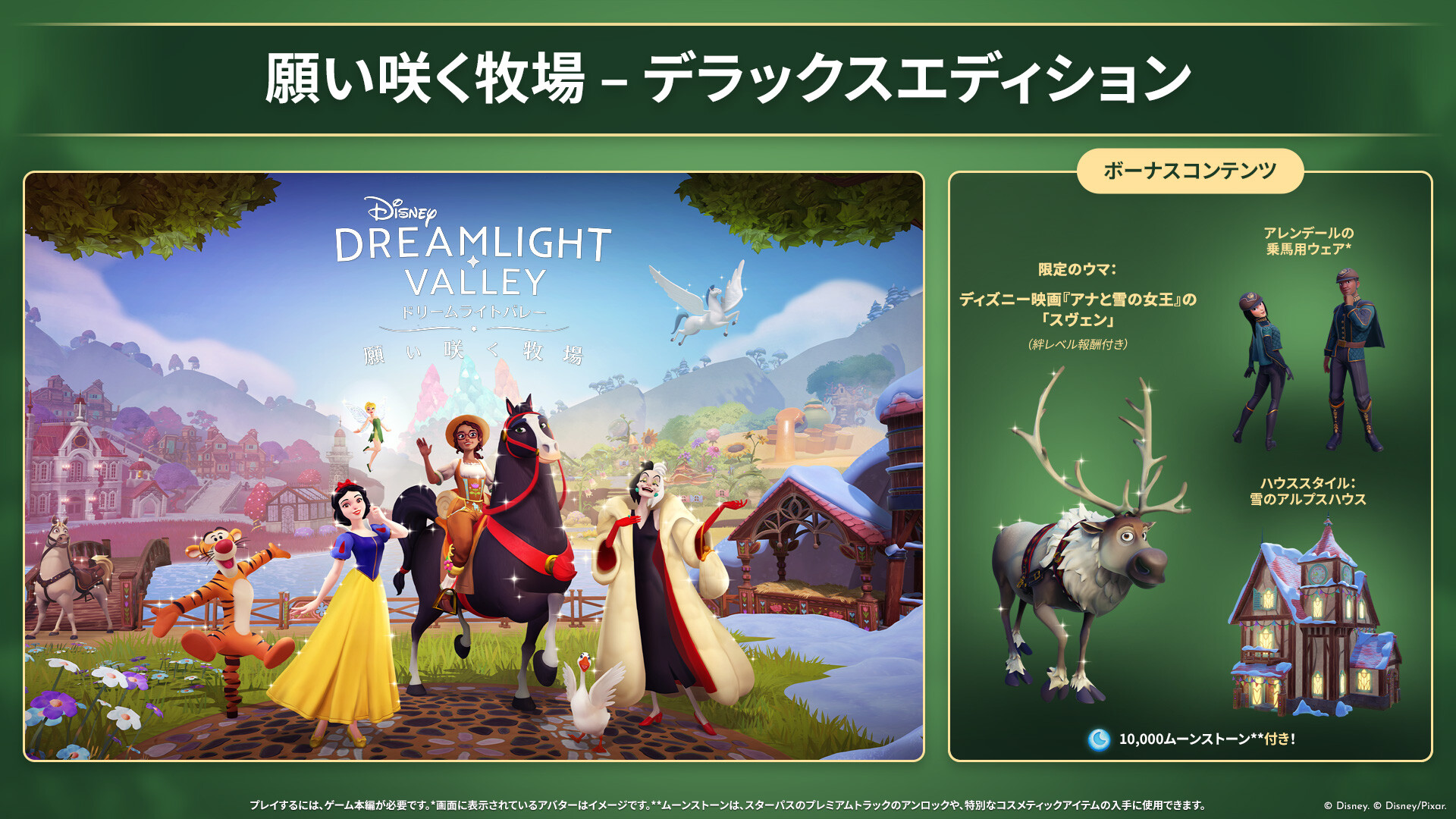 『ディズニー ドリームライトバレー:願い咲く牧場 – デラックスエディション』には10,000ムーンストーンと以下の限定デジタルアイテムが含まれます。