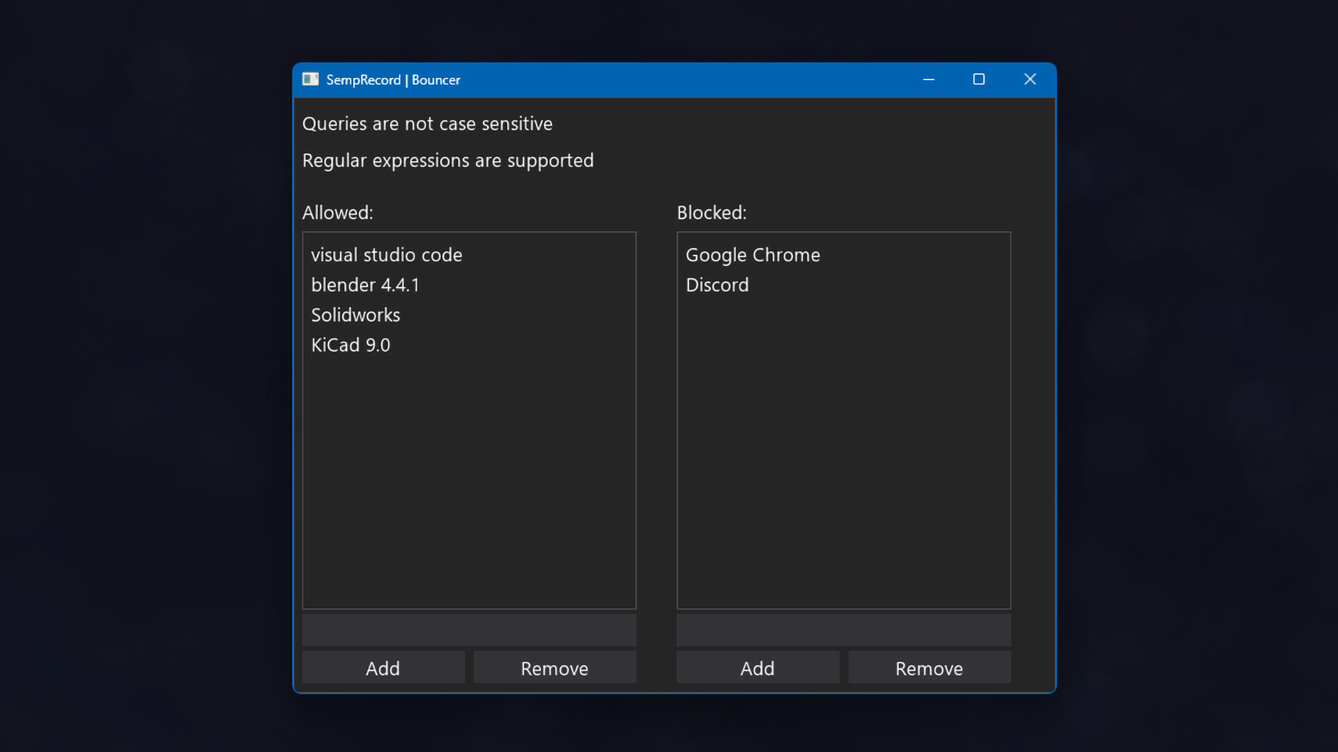 When any app in this list is launched semprecord will trigger a new recording session.