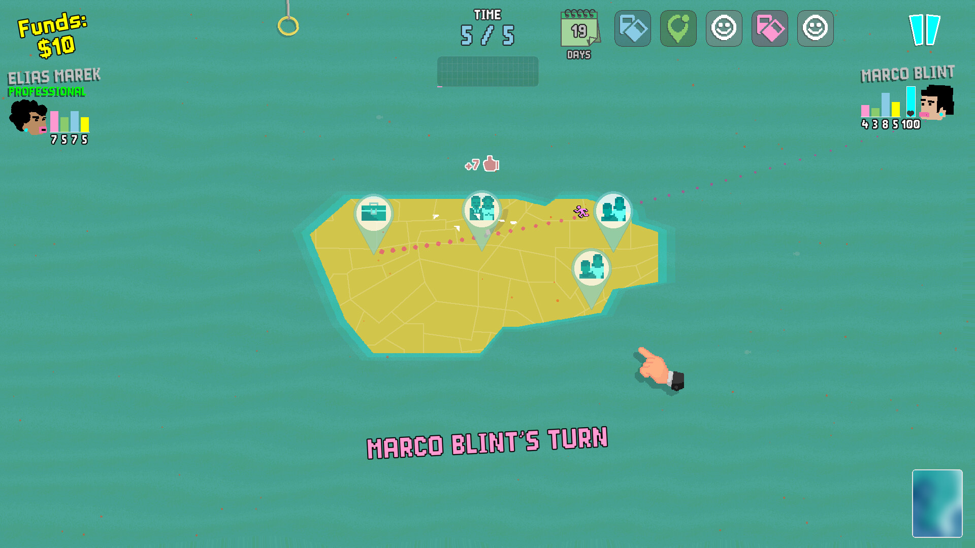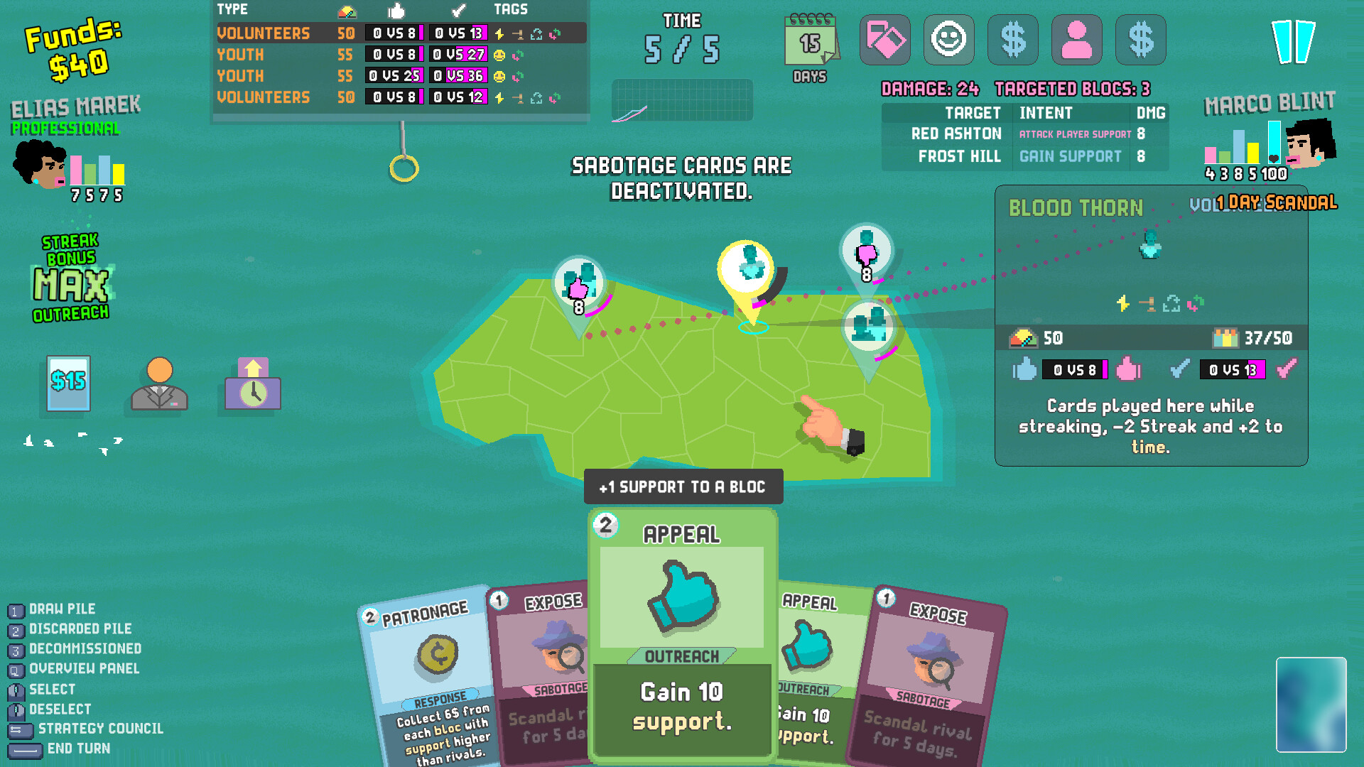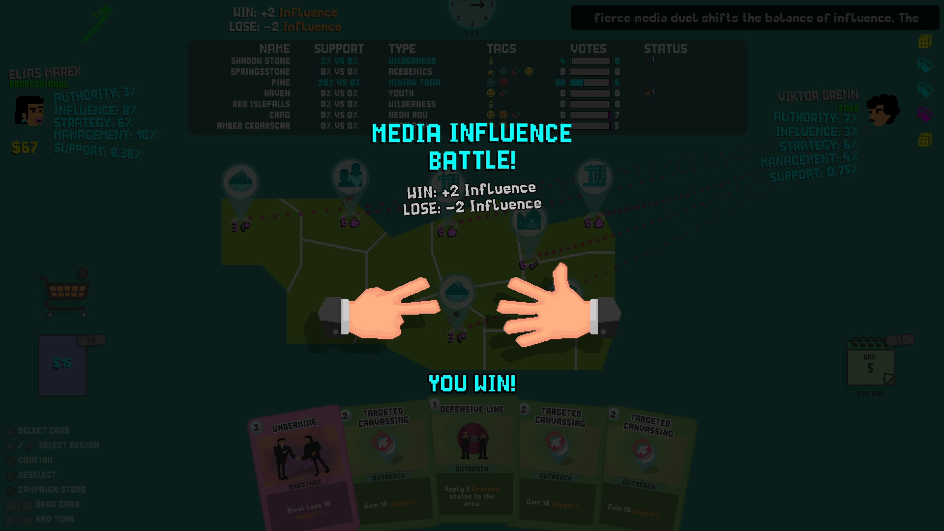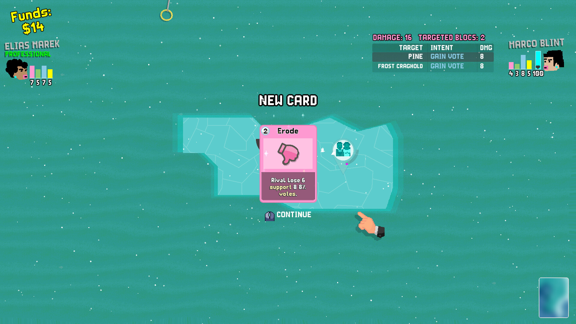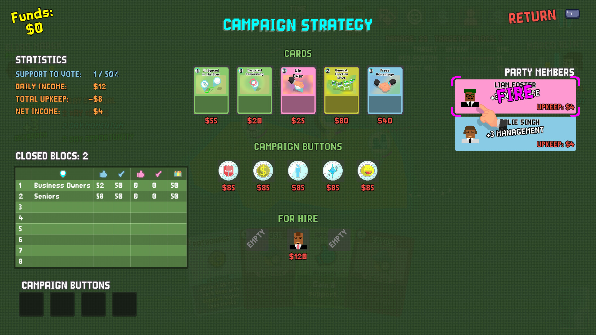 A rogue-lite card game with a light-hearted spin on politics where debates are settled with rock-paper-scissors, support comes from spinning the wheel, and every move can make or break your campaign. Win votes through outreach, sabotage rivals until they quit, or hoard funds to fuel your next run.