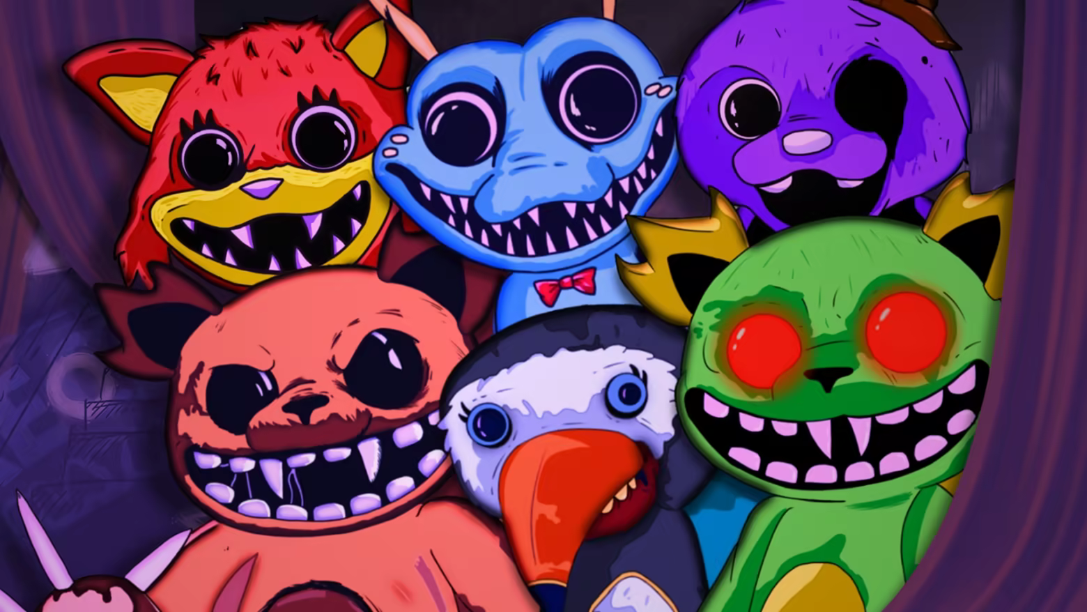 The main cast of characters from the hit 80’s programme ‘Jolly Junction’. This particular group of characters ruled over the entertainment market for years. Until, they didn’t. Their colours faded, and so did the child-like wonder inside of them. And now it's up to you to get rid of them. They’re due for one last play-date. Despite their evil intent, playing is what they do best…